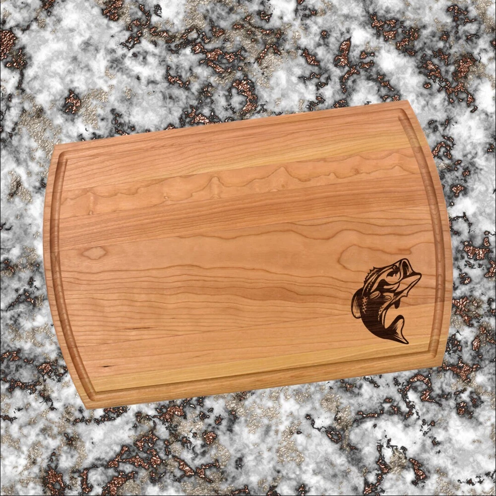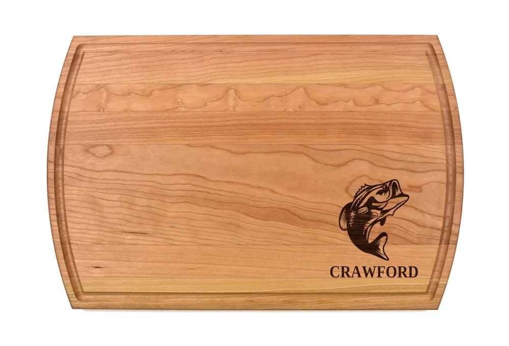 Design: Personalized Bass Cutting Board or Charcuterie Serving Tray All items ship via USPS - please make sure your address is correct :-) Whether used as a charcuterie serving tray for snacks or cutting board, our bamboo, walnut and cherry custom boards are the perfect addition for the home and make the perfect gift for your loved one celebrating a birthday, anniversary, new home, wedding, etc! *** FEATURES *** • SIZES: We have multiple styles and sizes available. To see our current sizes available, click the drop-down menu. The photo slide contains a photo showing each side by side. Please note, the board with the juice groove only has the groove on the front side of the board. • THICKNESS: Bamboo Boards - Approximately 1/2" Thick; Walnut & Cherry Boards - Approximately 3/4” Thick • UNIQUE: Every board is unique with the grain and coloring varying throughout - no board is the same! • CARE INSTRUCTIONS: Hand wash only with warm water. Do not soak. Please apply mineral oil throughout the board’s life. • PERSONALIZATION/CUSTIMIZATION: Do you want the text placed differently on the board? Please don’t hesitate to contact us. All personalization notes can be entered in the personalization box when checking out. • SHIPPING: All cutting boards ship within 2 to 5 business days. • WHOLESALE ORDERS: Please don’t hesitate to contact us for information about wholesale orders. Processing times for larger orders may change. • NOTE: Colors can vary a bit on different monitors and screens. Any props included in photos are not included. Please be sure to double-check your address to make sure it is accurate for USPS delivery. If a package is returned to us due to an invalid address, the buyer is responsible for all additional shipping charges. We appreciate you supporting small business – best wishes! For items ordered with simple edits, we do not send proofs since the layout doesn't change from the example(s). However, in the event there are requests that change the layout from the example(s), we do send proofs for approval before making the product. If you'd like a proof before we make the product, please note so in the personalization box.