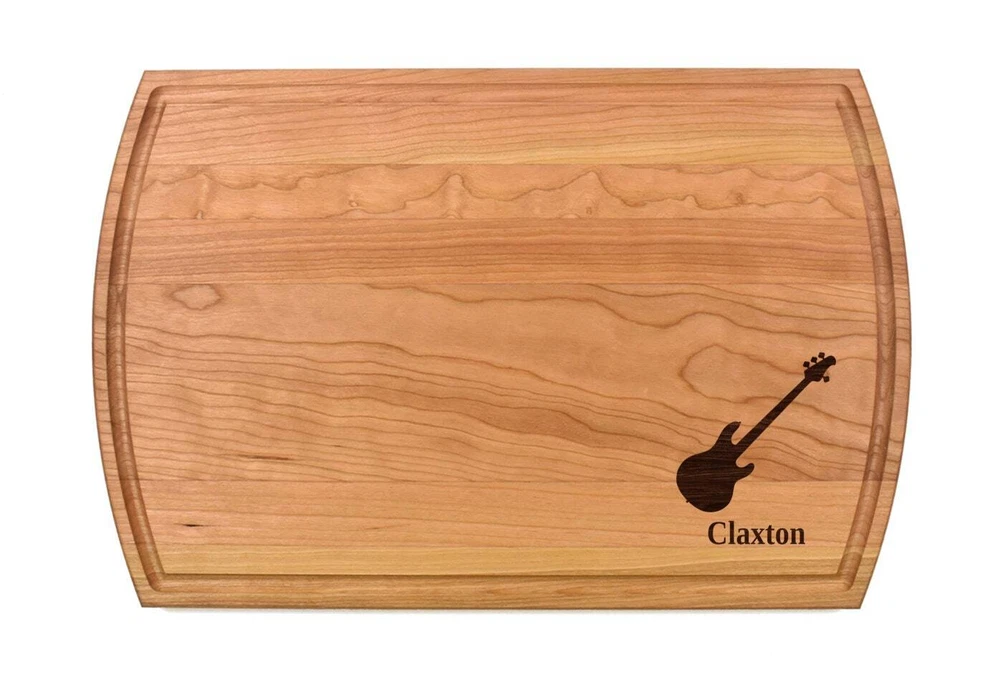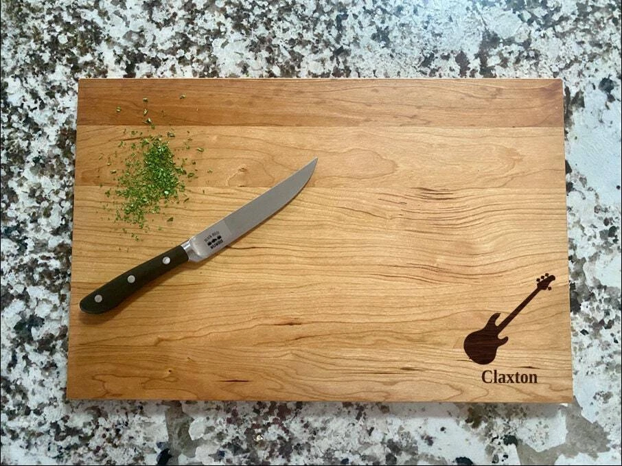 Design: Personalized Bass Guitar Cutting Board or Charcuterie Serving Tray All items ship via USPS - please make sure your address is correct :-) Whether used as a charcuterie serving tray for snacks or cutting board, our bamboo, walnut and cherry custom boards are the perfect addition for the home and make the perfect gift for your loved one celebrating a birthday, anniversary, new home, wedding, etc! *** FEATURES *** • SIZES: We have multiple styles and sizes available. To see our current sizes available, click the drop-down menu. The photo slide contains a photo showing each side by side. Please note, the board with the juice groove only has the groove on the front side of the board. • THICKNESS: Bamboo Boards - Approximately 1/2" Thick; Walnut & Cherry Boards - Approximately 3/4” Thick • UNIQUE: Every board is unique with the grain and coloring varying throughout - no board is the same! • CARE INSTRUCTIONS: Hand wash only with warm water. Do not soak. Please apply mineral oil throughout the board’s life. • PERSONALIZATION/CUSTIMIZATION: Do you want the text placed differently on the board? Please don’t hesitate to contact us. All personalization notes can be entered in the personalization box when checking out. • SHIPPING: All cutting boards ship within 2 to 5 business days. • WHOLESALE ORDERS: Please don’t hesitate to contact us for information about wholesale orders. Processing times for larger orders may change. • NOTE: Colors can vary a bit on different monitors and screens. Any props included in photos are not included. Please be sure to double-check your address to make sure it is accurate for USPS delivery. If a package is returned to us due to an invalid address, the buyer is responsible for all additional shipping charges. We appreciate you supporting small business – best wishes! For items ordered with simple edits, we do not send proofs since the layout doesn't change from the example(s). However, in the event there are requests that change the layout from the example(s), we do send proofs for approval before making the product. If you'd like a proof before we make the product, please note so in the personalization box.