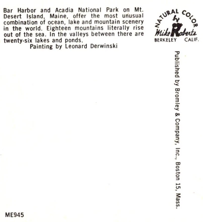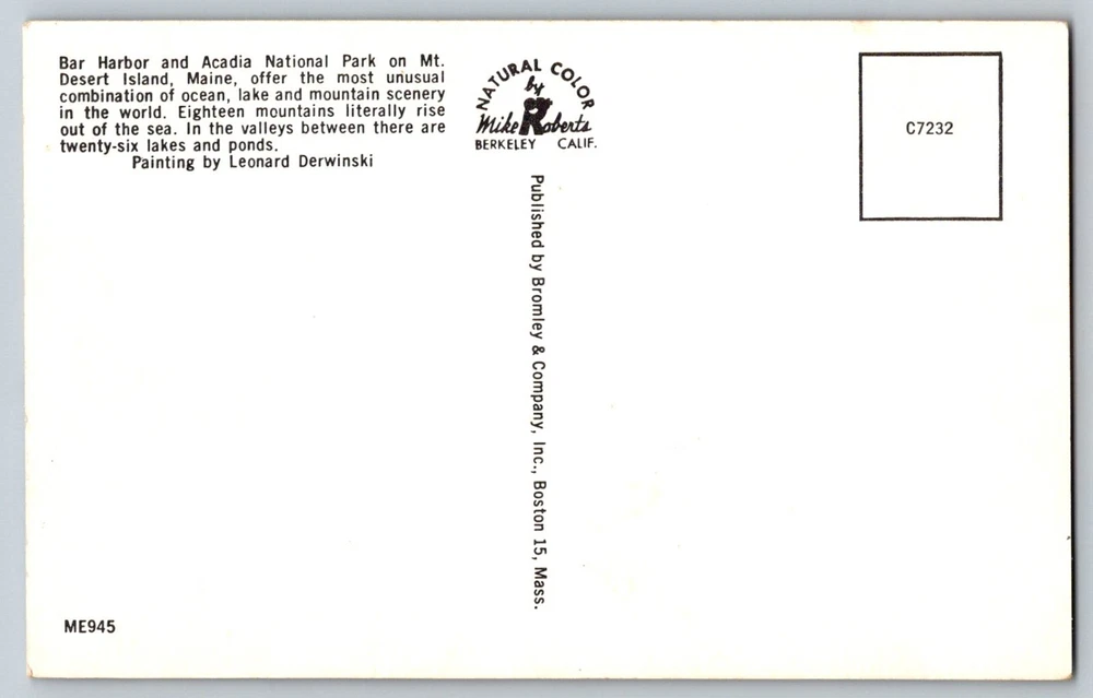 TITLE: Mount Desert Island, Maine - Bass Harbor Head Lighthouse CAPTION: See image for caption SIZE: Standard Size (Approximately 5-1/2 x 3 - 1/2 inches) PUBLISHED BY: Bromley & Company POSTCARD ID #: C7232 & ME945 POSTMARK: No Stamp - No Postmark Please view the images, as they are part of the description. Postcard is from a previous collection, and shows normal wear and tear for its age; as such, it may contain peeling, corner bumps, creases and writing/marks. We try to highlight any obvious flaws; please view the photos, including the zoom feature, to gauge the condition of the card, as these images are part of the description. Please ask any questions prior to bidding. Each postcard is sleeved in a clear 2mil sleeve made out of polyethylene, polypropylene and polyester. All of these materials have passed the Photo Activity Test (P.A.T.) certifying that they are safe for long-term storage. We combine shipping charges on items purchased in the same order. If you are interested in purchasing several items, please use ADD TO CART, and we will invoice you with the correct total. Thank you for looking! Good luck on your bidding.