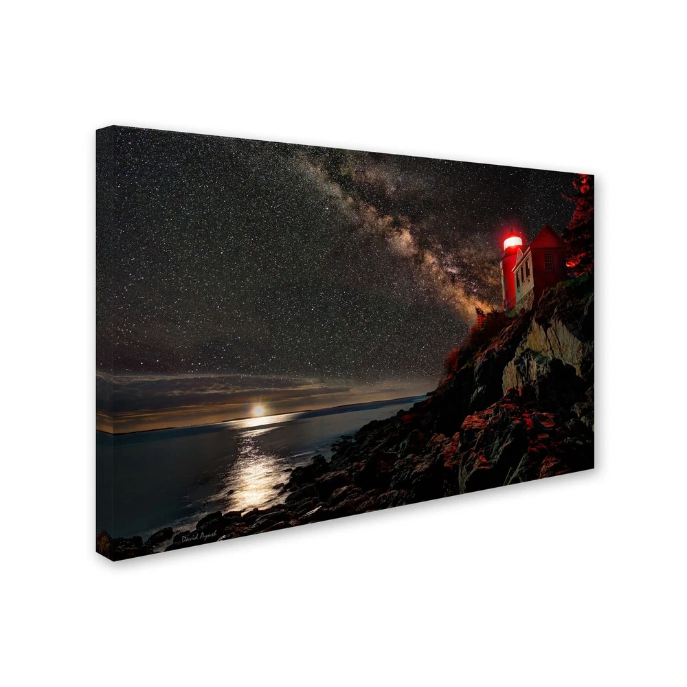 This ready to hang, gallery-wrapped art piece features a landscape of the Bass Harbor Lighthouse at night. Masters Fine Art is a company that travels around the world to bring the best in fine art from outstanding artists from different lands. They believe that art is the soul of the world, that it represents our human essence. MFA works mostly with Latin American art. It portrays a happy view of life, represented with bright beautiful colors, music, dance, love, hope and happiness, giving us the feeling that we can overcome all hardships with all the beautiful things we still have in life. The art Masters Fine art carries is many things: colorful, contemporary, sexy, emotional, musical, romantic. Above all it is beautiful and full of joy. Giclee (jee-clay) is an advanced printmaking process for creating high quality fine art reproductions. The attainable excellence that Giclee printmaking affords makes the reproduction virtually indistinguishable from the original piece. The result is wide acceptance of Giclee by galleries, museums and private collectors. Gallery wrap is a method of stretching an artist's canvas so that the canvas wraps around the sides and is secured a , wooden frame. This method of stretching and preparing a canvas allows for a frameless presentation of the finished painting. Artist: masters fine art Subject: landscapes Style: contemporary Product type: gallery-wrapped canvas art Made in USA