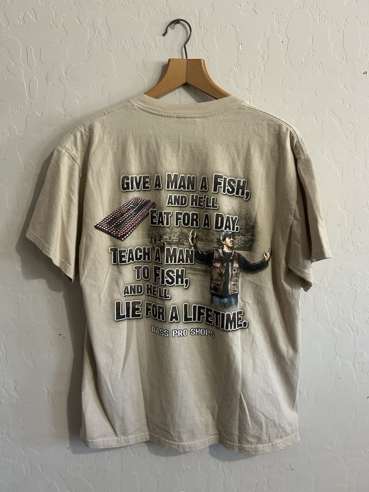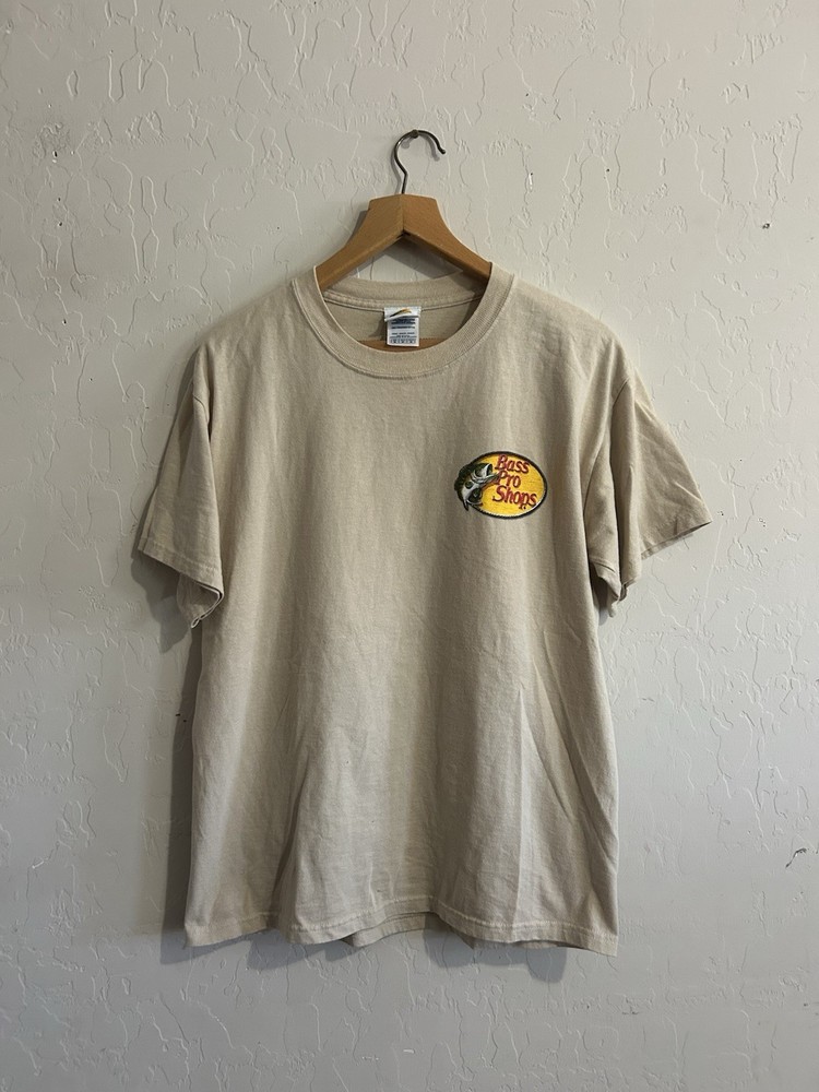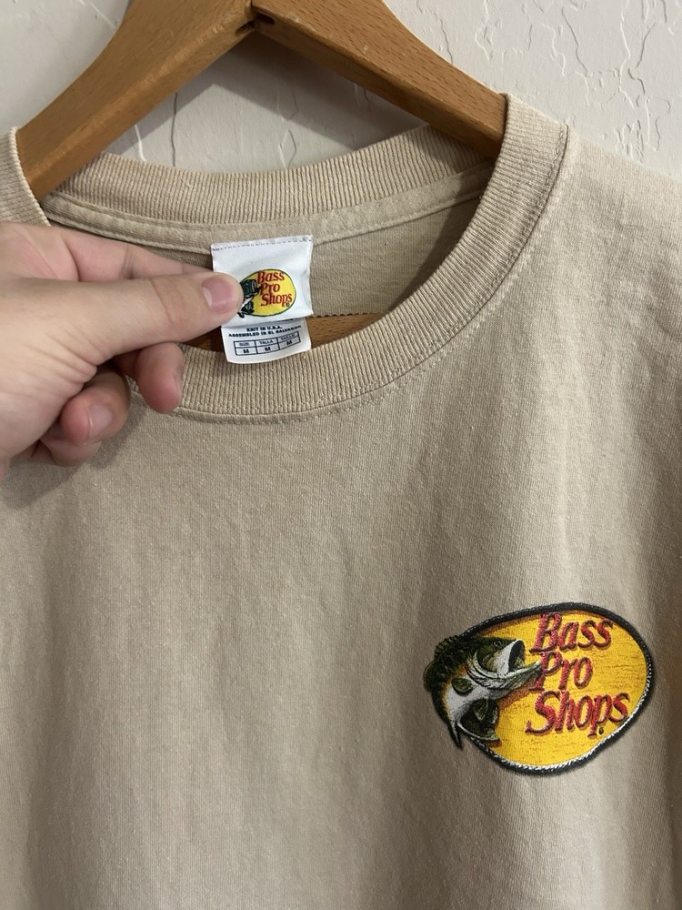This Bass Pro Shops shirt in size medium is a solid beige color with a crew neck and short sleeves, made of cotton knit fabric. The shirt features the brand's logo as an accent and is machine washable. It is designed for regular fit and suitable for all seasons, specifically summer, fall, and spring. This classic t-shirt is perfect for men looking for a comfortable and versatile addition to their wardrobe.