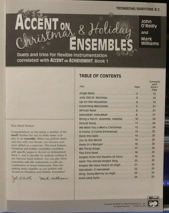 We combine shipping. All pieces are pulled, weighed and shipped together according to the weight of the order. Items are shipped media mail unless requested otherwise. We are shipping items as fast as possible, but because we are pricing music way below wholesale, we have lots of sales. If you need something fast, send an email and we will process it ASAP. The post office is currently being slowed down and most items are taking lots of extra time to be delivered. If you need your item by a certain time you may want to consider shipping it via Priority Mail or even first class if it weighs under 1 pound once wrapped up. NOTE: Postage rated increased January 24, 2021. New Bassoon or Electric Bass book Accent on Christmas & Holiday Ensembles Duets and Trios for flexible instrumentation correlated with Accent on Achievement Book 1 John O’Reilly Mark Williams From the publishers: Accent on Christmas & Holiday Ensembles is an exciting book of duets, trios, and quartets for flexible instrumentation that correlates with Accent on Achievement, Book 1. Since the instrumentation is flexible, any combination of instruments can play together. Title Jingle Bells Jolly Old St. Nicholas Up on the Housetop Good King Wenceslas African Noel Hanukkah, Hanukkah Bring a Torch, Jeanette, Isabella Dreydl Song We Wish You a Merry Christmas O Come, O Come Emmanuel Deck the Halls Joy to the World Away in a Manger We Three Kings The First Noel Angels from the Realms of Glory Hark! The Herald Angels Sing Angels We Have Heard on High Hanukkah, O Hanukkah Ding, Dong Merrily on High Auld Lang Syne Accent on Christmas & Holiday Ensembles, Grade 1 based on 1=beginner to 6=advanced. Published by Alfred Publishing. NOTE: CHANGES IN SHIPPING METHODS: If you want to purchase more than one item, we combine shipping. Ebay used to have a “request an invoice” button but I think they removed it. Try alternating shipping or the “local pick up” buttons so it does not add a shipping charge for each item. Whatever you do, any excess shipping will be refunded when we ship your item because the shipping cost is based on the weight of the items, not the number of them. If you to know what the combined shipping would be, you can send a message with the names & item numbers of the ones you want and we will pull them and weigh them, then let you know what the combined shipping will be. But you run the risk of someone else buying the music as most of our items are one only. And as a final method of ordering without paying the individual shipping costs purchasing, you can buy all of them with “local pickup” checked, and request us to send you a “Special item” that has the total combined shipping as the cost of the item. Any shipping costs paid that are not needed will be refunded to you once we have your item ready to ship. We are a non-smoking household. There may be cat hair on items, but we do our best to remove it before shipping. If you are violently allergic to cat hair, you should not purchase this item. Cat, if pictured, not included. If you need an item quickly, please email us and let us know, we will try to ship it as soon as possible. No guarantees, but we will try. Items will be sent insured and the cost will be included in the shipping charges. Expensive and large items will require a signature at delivery (to protect your package from getting “lost”) We only charge shipping costs. Occasionally we have to get specific shipping materials, new boxes (I try to recycle any boxes we have), cutting cardboard costs or have a friend take packages to the shipping office (I am slightly disabled and sometimes need help), someone to cut cardboard inserts and those might be the only needed included expenses that I can think of. Any funds paid that are not needed will be refunded to you once we have your item ready to ship. The shipping costs stated is for media mail. No matter what ebay says, it could take up to 30 days for you to receive your item. The farther away from Southern California you are, the longer it may take for your item to arrive. If you need it quickly, please let us know and we can quote you the shipping costs for first class, priority or overnight delivery costs. We always combine shipping to save you money. If there is any problem, please contact us before contacting ebay. We can fix any problem easier if the “Corporate Ebay” is not involved. Email us if you have any questions. Items are not returnable. We are a non-smoking home. No returns. Good luck and happy bidding!