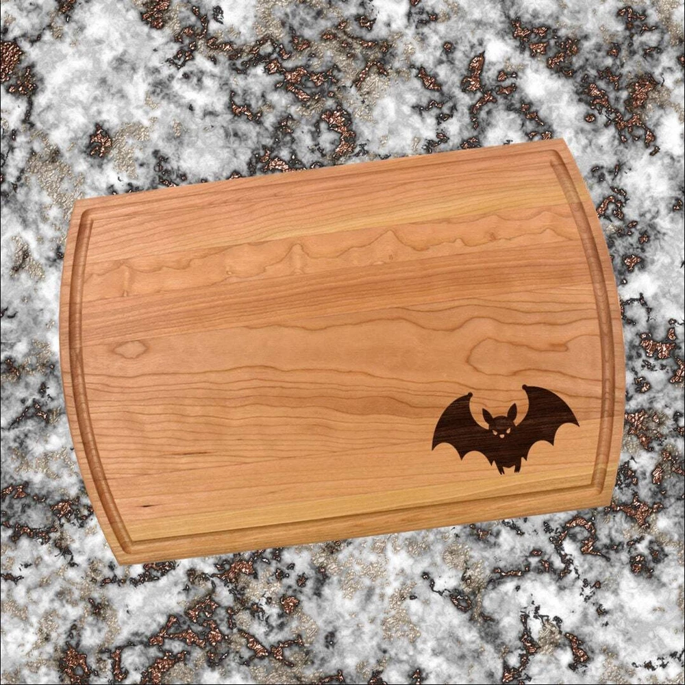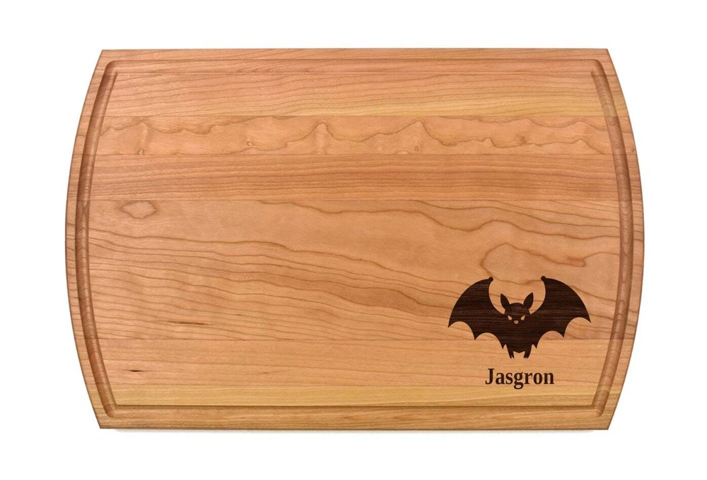 Design: Personalized Bat Cutting Board or Charcuterie Serving Tray All items ship via USPS - please make sure your address is correct :-) Whether used as a charcuterie serving tray for snacks or cutting board, our bamboo, walnut and cherry custom boards are the perfect addition for the home and make the perfect gift for your loved one celebrating a birthday, anniversary, new home, wedding, etc! *** FEATURES *** • SIZES: We have multiple styles and sizes available. To see our current sizes available, click the drop-down menu. The photo slide contains a photo showing each side by side. Please note, the board with the juice groove only has the groove on the front side of the board. • THICKNESS: Bamboo Boards - Approximately 1/2" Thick; Walnut & Cherry Boards - Approximately 3/4” Thick • UNIQUE: Every board is unique with the grain and coloring varying throughout - no board is the same! • CARE INSTRUCTIONS: Hand wash only with warm water. Do not soak. Please apply mineral oil throughout the board’s life. • PERSONALIZATION/CUSTIMIZATION: Do you want the text placed differently on the board? Please don’t hesitate to contact us. All personalization notes can be entered in the personalization box when checking out. • SHIPPING: All cutting boards ship within 2 to 5 business days. • WHOLESALE ORDERS: Please don’t hesitate to contact us for information about wholesale orders. Processing times for larger orders may change. • NOTE: Colors can vary a bit on different monitors and screens. Any props included in photos are not included. Please be sure to double-check your address to make sure it is accurate for USPS delivery. If a package is returned to us due to an invalid address, the buyer is responsible for all additional shipping charges. We appreciate you supporting small business – best wishes! For items ordered with simple edits, we do not send proofs since the layout doesn't change from the example(s). However, in the event there are requests that change the layout from the example(s), we do send proofs for approval before making the product. If you'd like a proof before we make the product, please note so in the personalization box.