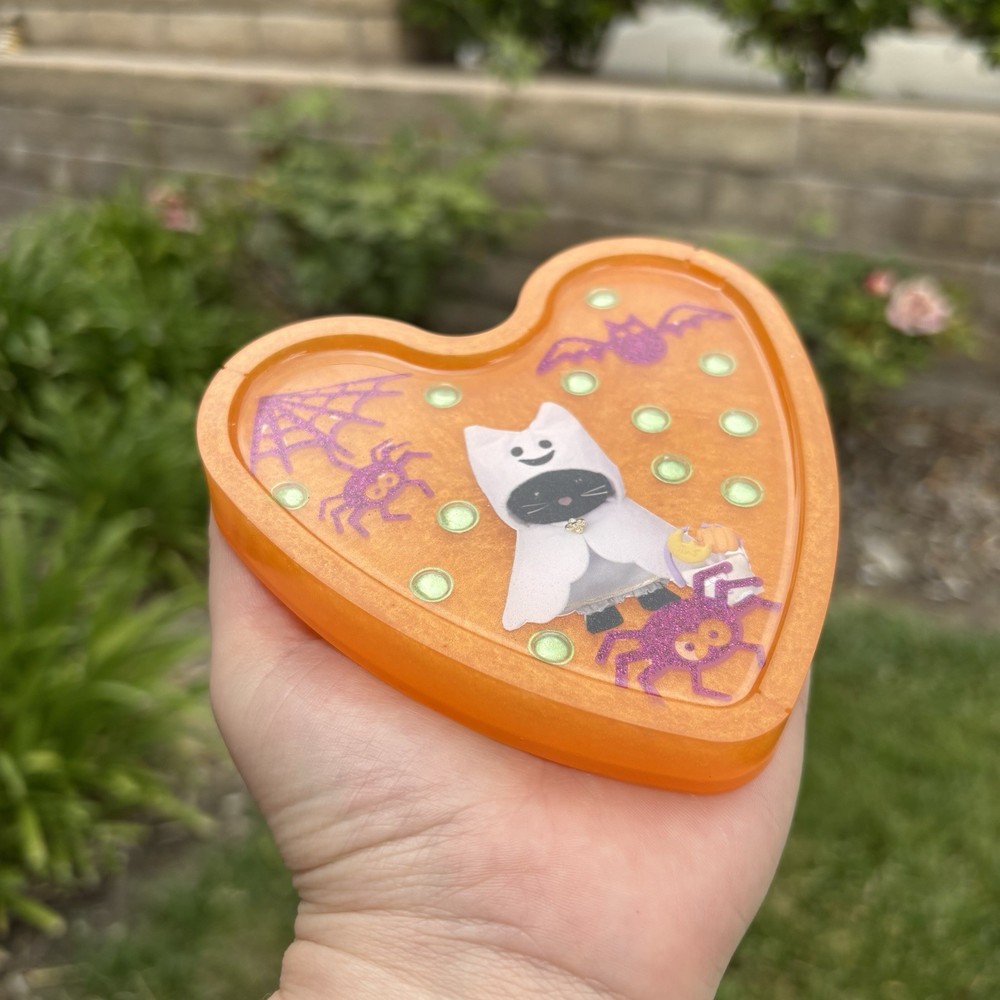 ‘Halloween Spirit’ Calico Critters Inspired Ghost Spider and Bat Halloween Colored Heart Shaped Resin Coaster Handmade by Shop EarthySmurf. *Please note, resin is an imperfect art. Craters, holes, sharp edges, bubbles and more may be present in your piece. Please examine all pictures*