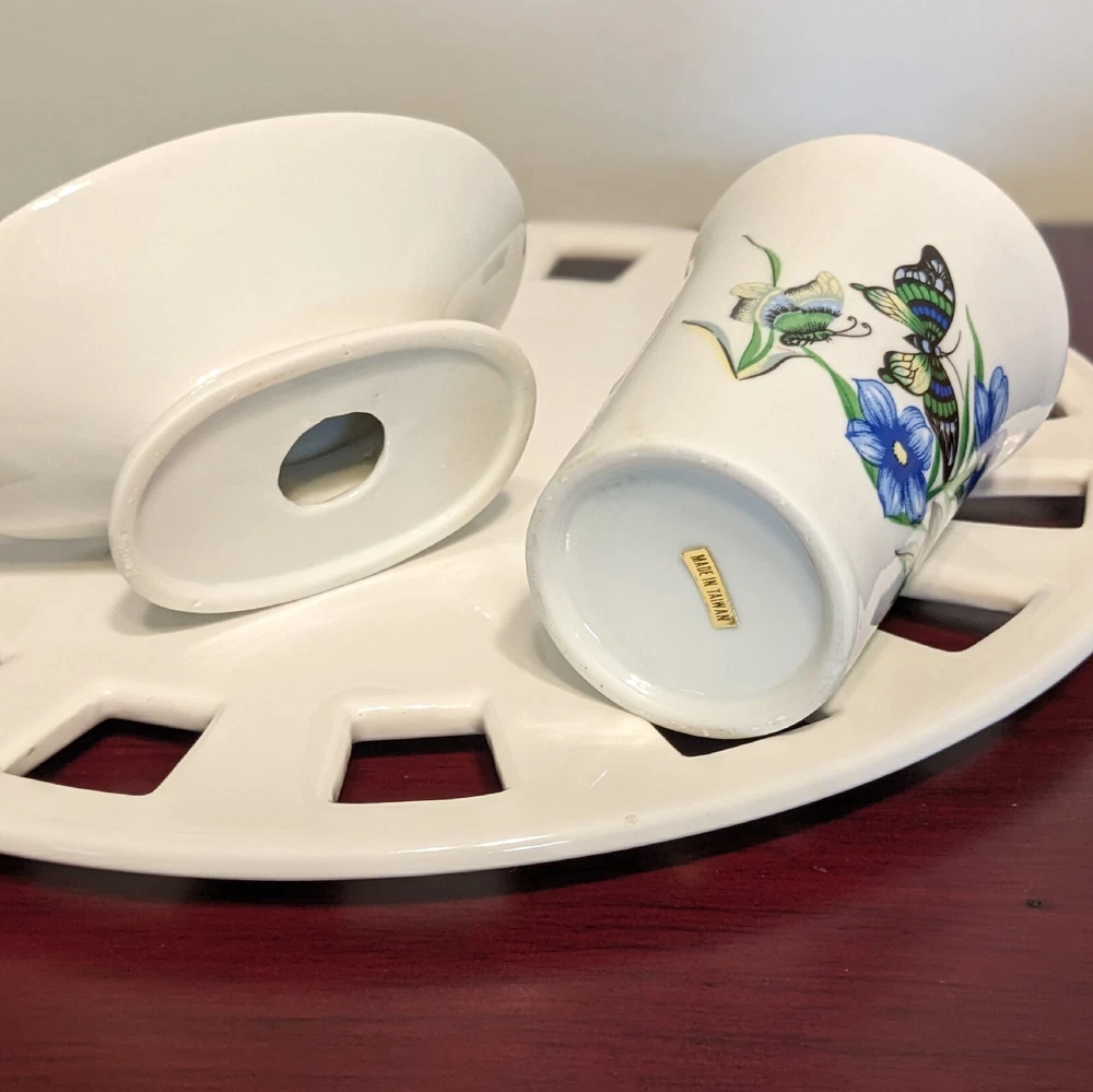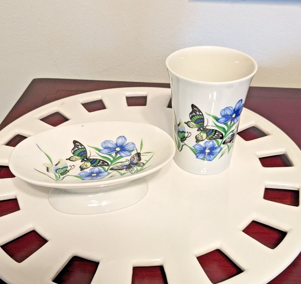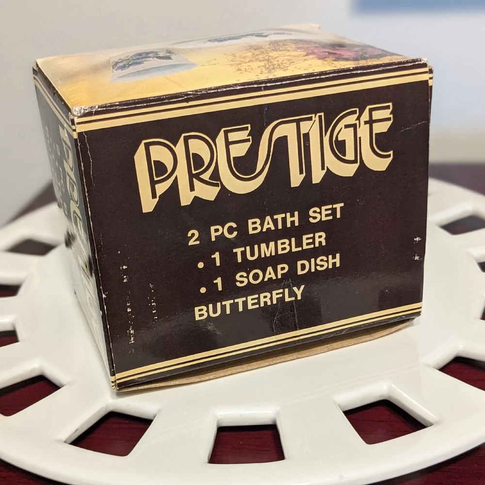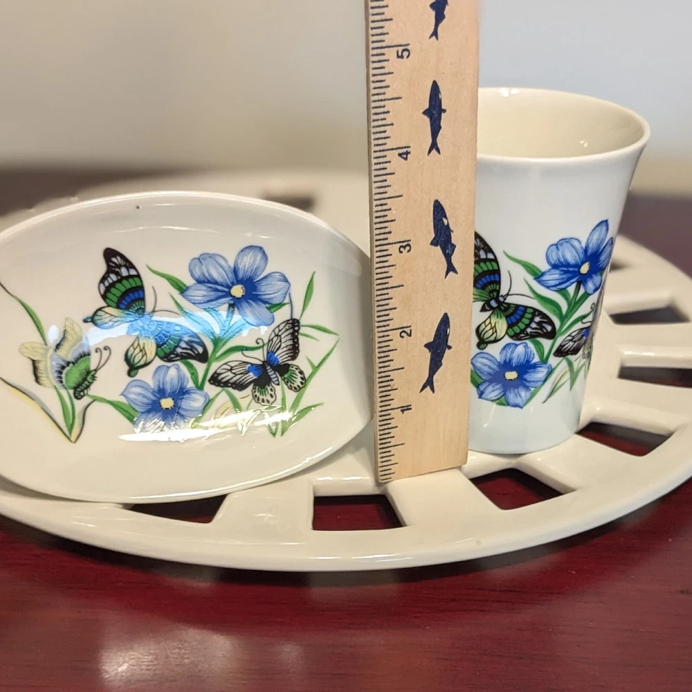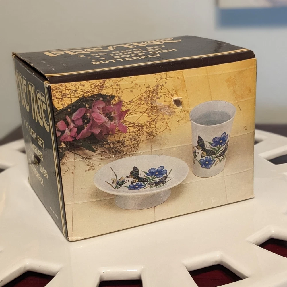 New In Box Bathroom Tumbler Brush Holder & Soap Dish Flowers Butterflies VTG NOS. New in a vintage box and unused. Opened to photograph the pieces. Pretty scene with blue flowers and butterflies.