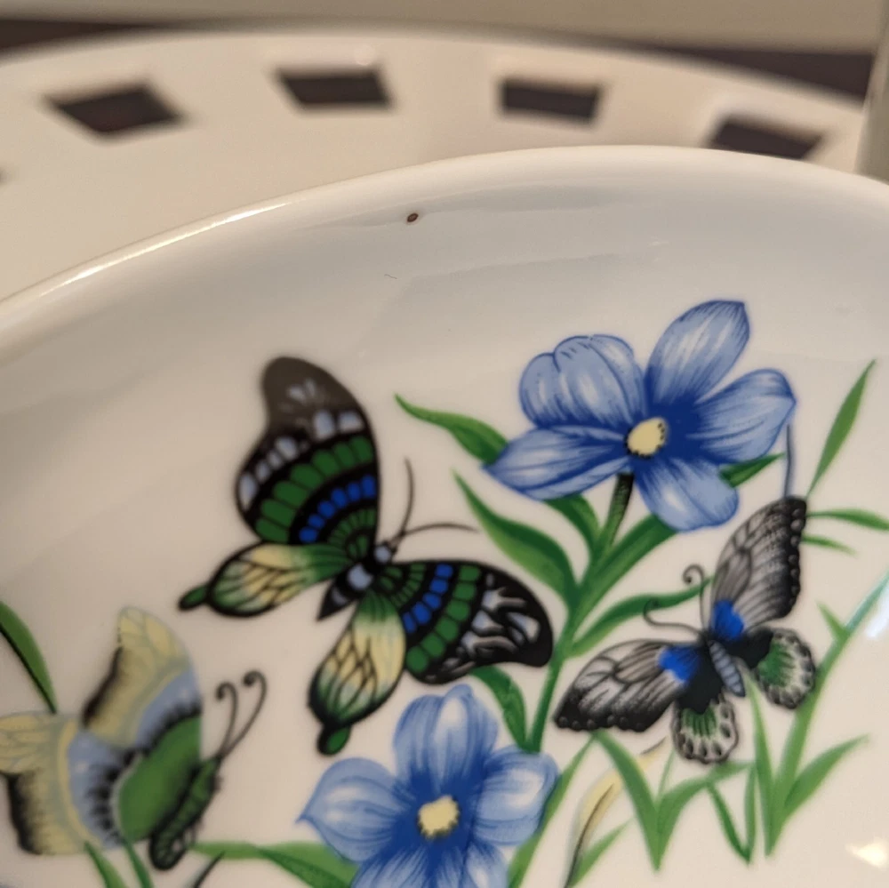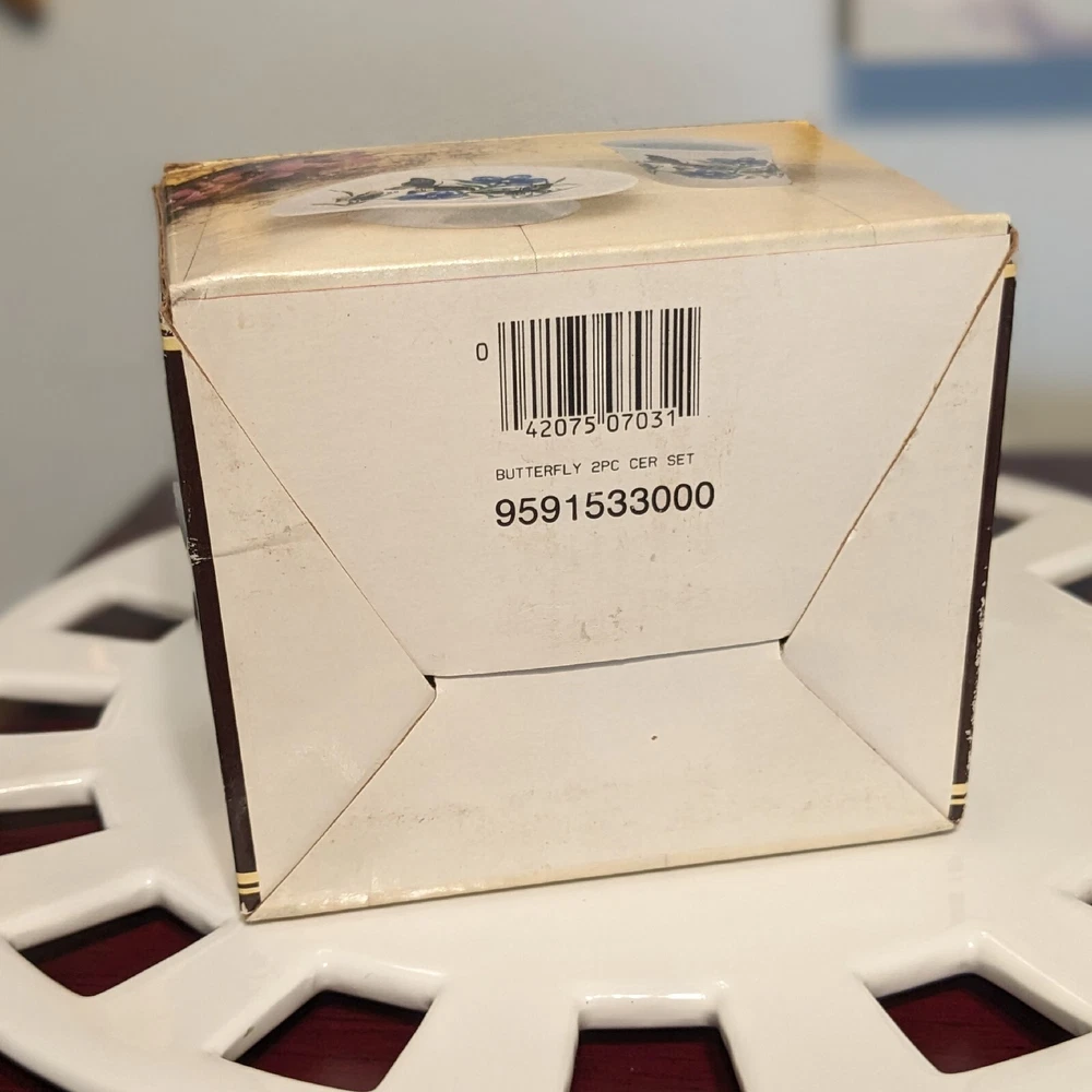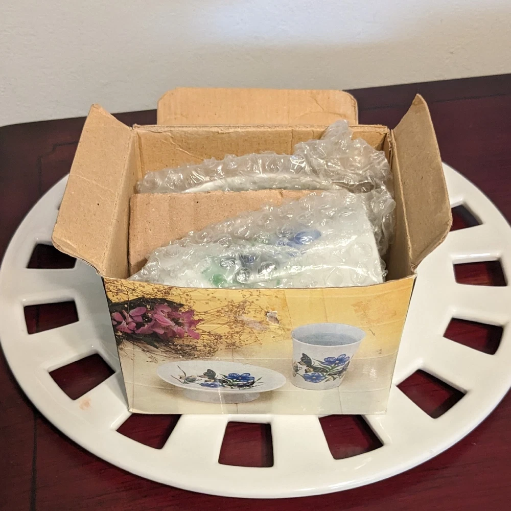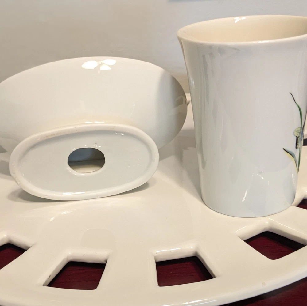 New In Box Bathroom Tumbler Brush Holder & Soap Dish Flowers Butterflies VTG NOS. New in a vintage box and unused. Opened to photograph the pieces. Pretty scene with blue flowers and butterflies.
