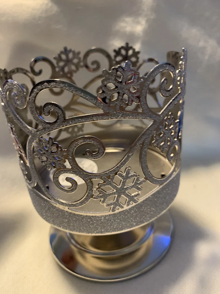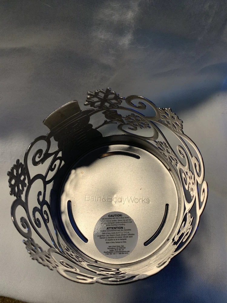 Bath and Body Works large holiday candle holder. Features a snowman on two sides. Silver with snowflakes throughout.