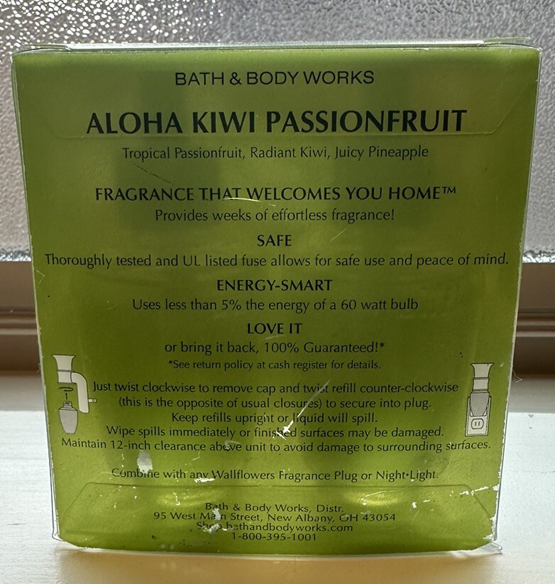 Transform any room into a fragrant oasis with these Bath & Body Works Aloha Kiwi Passionfruit Wallflowers. These wall plug-ins are designed to eliminate odors and deodorize the air in your home. The tropical scent of passionfruit, radiant kiwi, and juicy pineapple will motivate and energize you every time you walk in the room. These wallflowers are easy to install and come in a pack of two. They are perfect for any occasion and work as an aromatherapy tool to create a positive and happy atmosphere. The glass material and green color add a touch of elegance to any room. Get your hands on these Bath & Body Works Aloha Kiwi Passionfruit Wallflowers and experience the ultimate home fragrance.