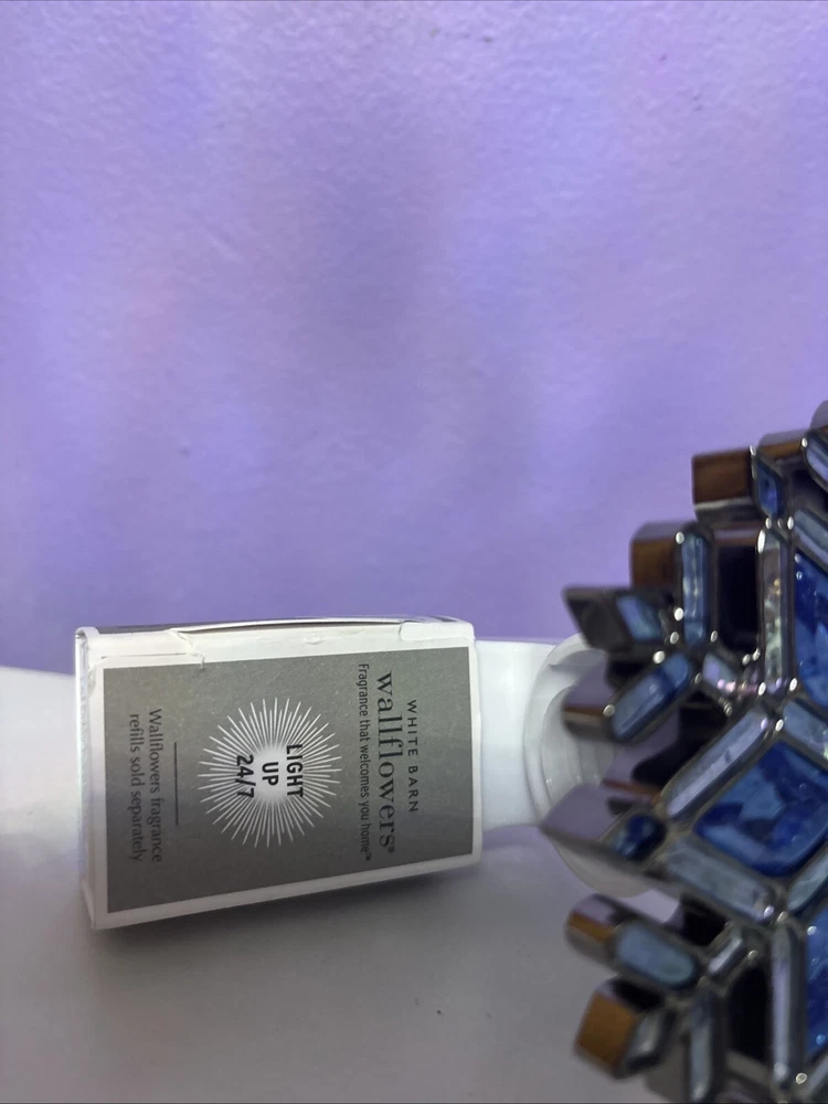 This Bath & Body Works Blue Snowflake Wallflower Plug In is a medium-sized wall plug-in fragrance diffuser featuring a traditional style with a blue plastic snowflake design. It is a single wallflower bulb plug that lights up 24/7, suitable for use in any room. Made in the United States, this plug-in is designed for adults and is branded by Bath & Body Works.