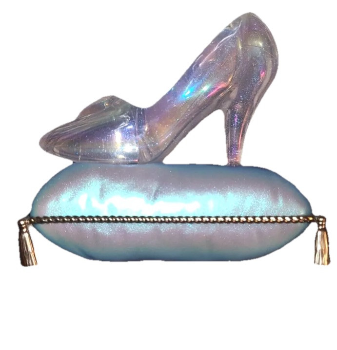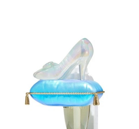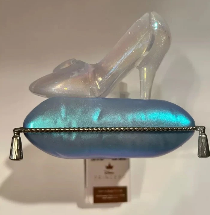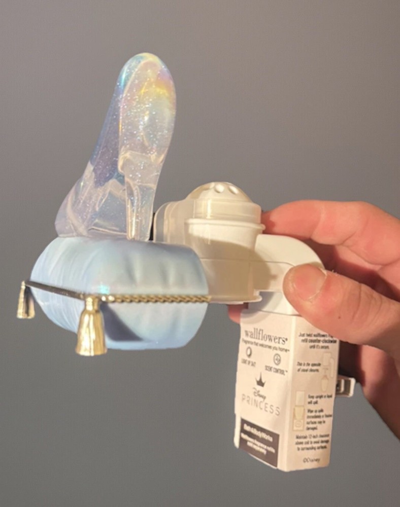 This Bath & Body Works Wallflower Plug is a Disney Princess Cinderella Slipper themed light-up nightlight. It is a medium-sized wall plug-in diffuser with a blue color and power source from a wall plug. It was manufactured in 2025 and features a light-up model.