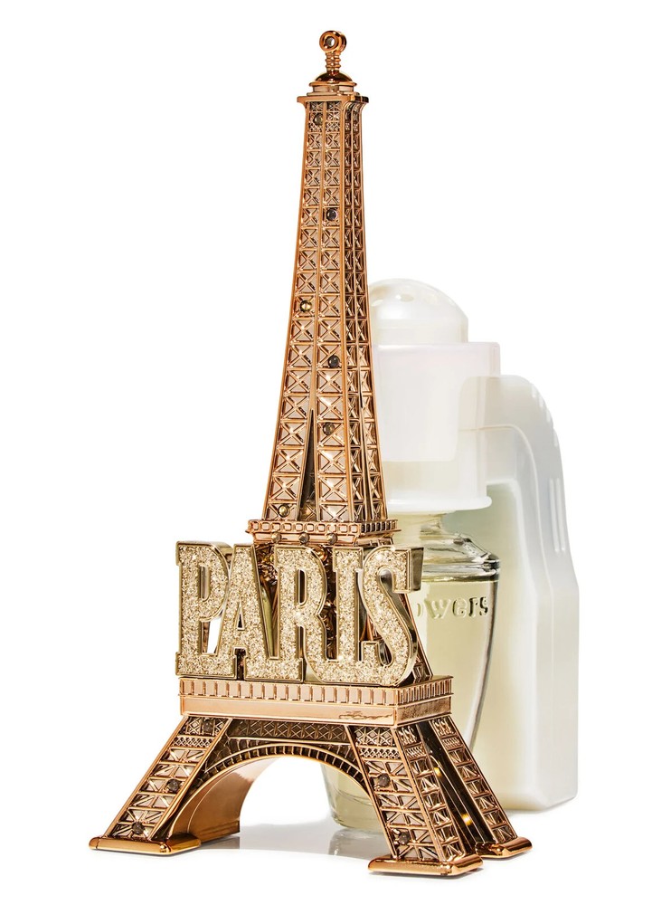 The Bath & Body Works Eiffel Tower Wallflower Plug is a large, gold plastic wall plug-in diffuser designed in a modern style with an Eiffel Tower theme. It is intended for aromatherapy use in the bedroom and is powered by a wall plug-in source. This plug features a single Wallflower bulb for diffusing fragrances, perfect for creating a pleasant ambiance in your living space. Ideal for adults, this plug is a unique and decorative addition to any room.