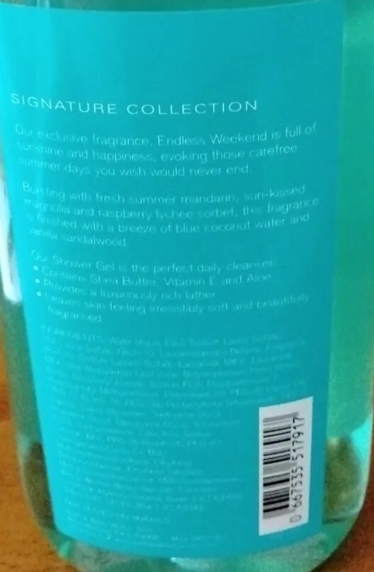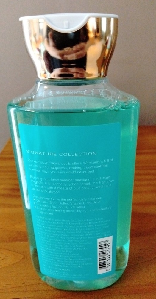 Country/Region of Manufacture:United StatesUPC:Does not applyFormulation:GelSize:Standard SizeType:Shower GelDepartment:UnisexVolume:10 fl ozBrand:Bath & Body WorksModel:Endless WeekendIngredients:Shea ButterProduct Line:Bath and Body worksgtin13:Does not apply