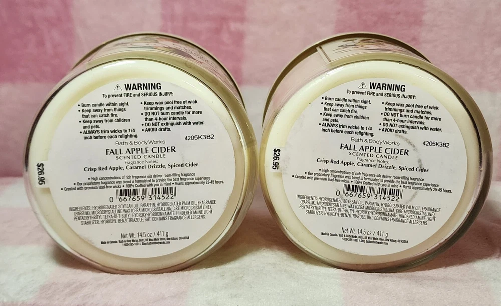 Hard to find no longer sold three wick (14.5 oz) candles, set of two, in "Fall Apple Cider" scent. Never burned or warmed. Not responsible for wax shifts in transit- please view all photos as this is the exact item you will receive. Ships with care next business day from smoke-free home.