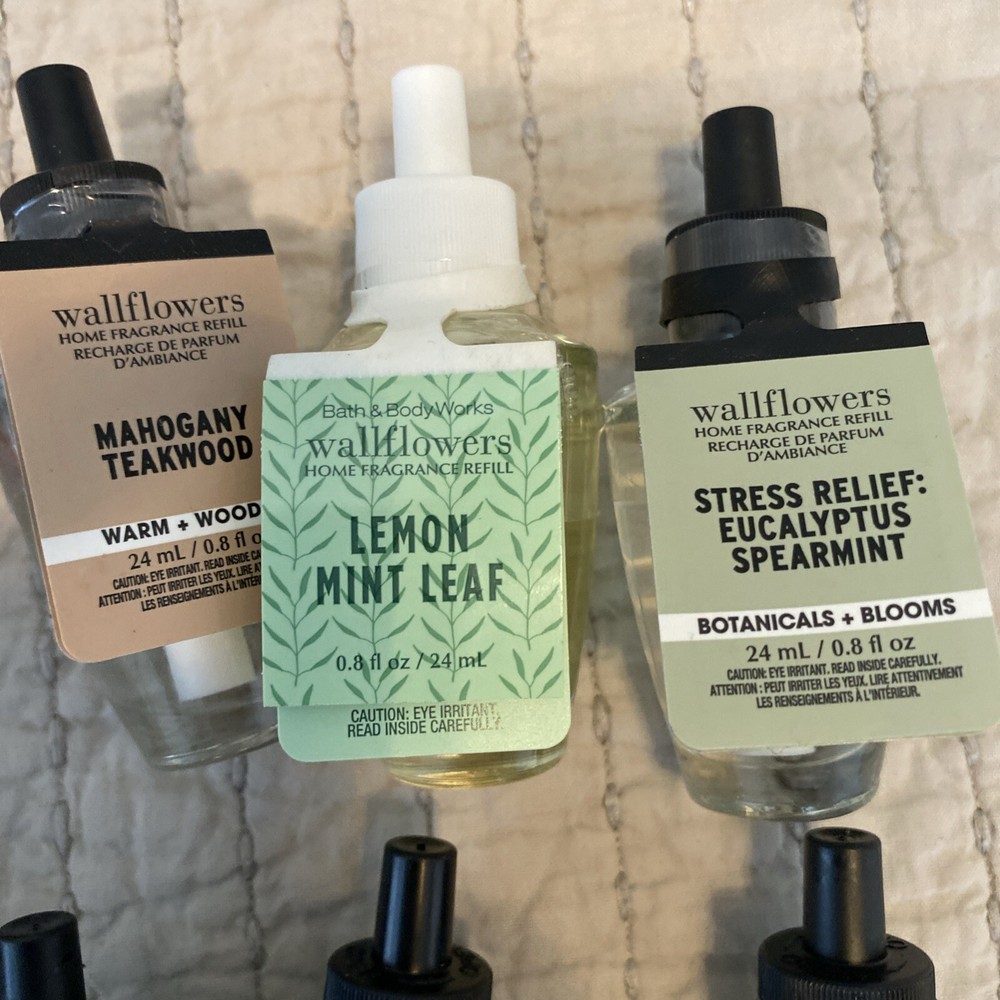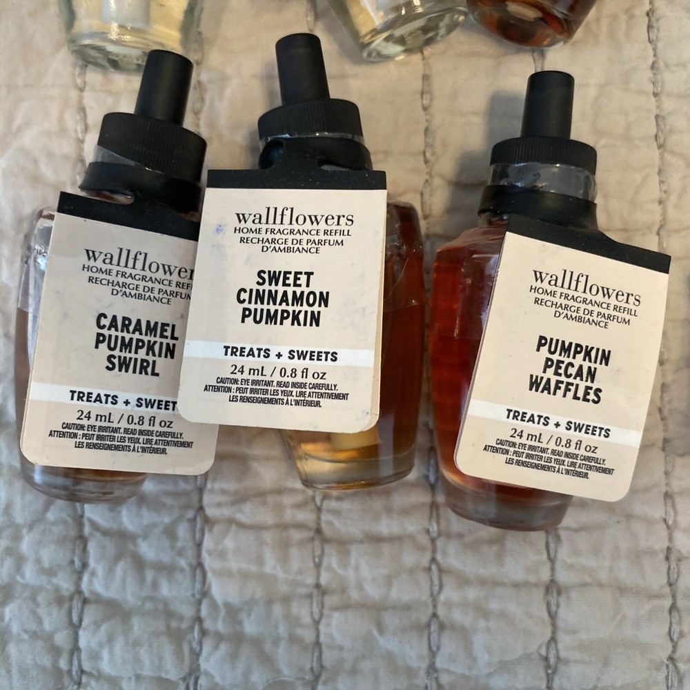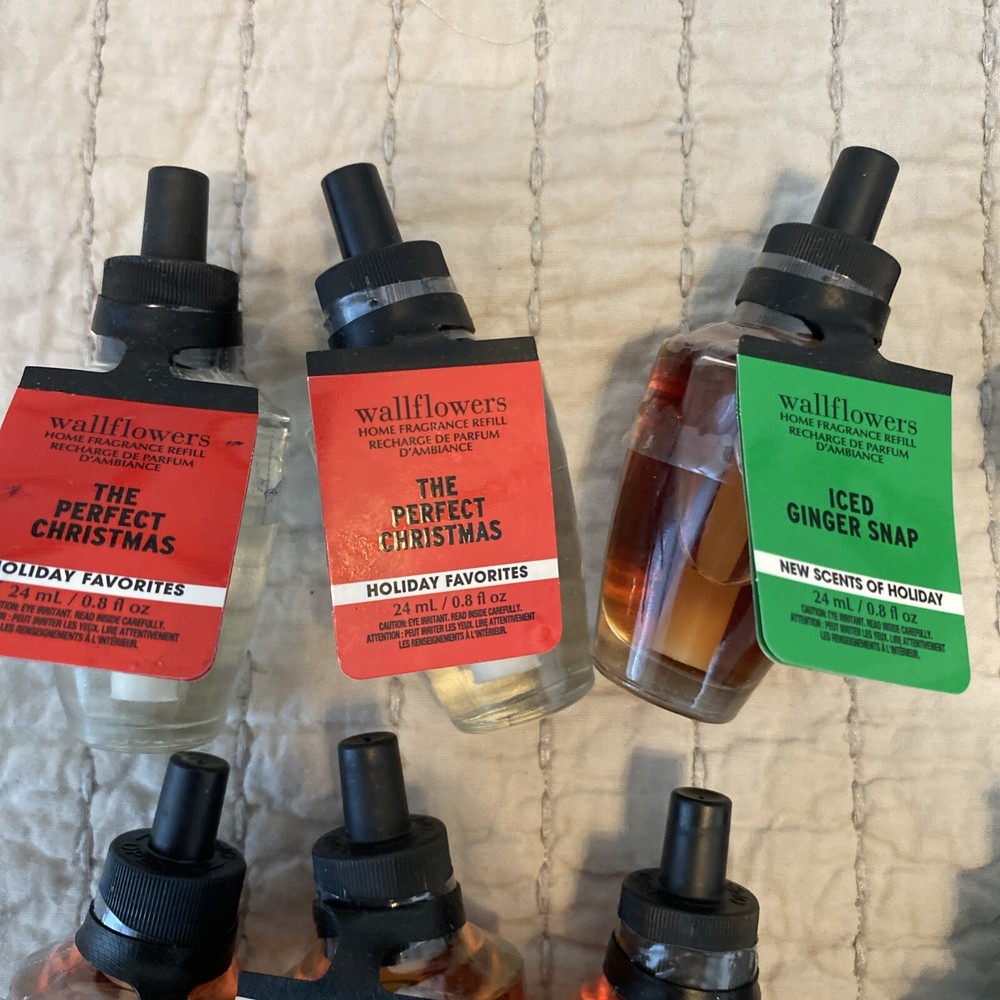 Bath & Body Works Holiday Wallflowers Refill Bulbs 12 Christmas Fall Everyday. New. Lot of 12: 2 - The perfect Christmas Iced ginger snap Caramel pumpkin swirl Fresh balsam Cozy Christmas PJs Under the Christmas tree Sweet cinnamon pumpkin Pumpkin pecan waffles Mahogany teakwood Lemon mint leaf Stress release eucalyptus spearmint
