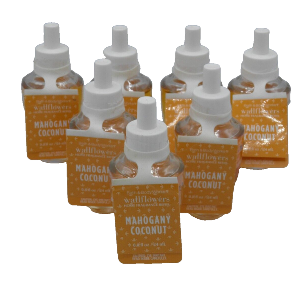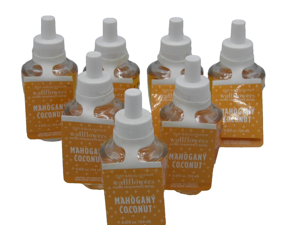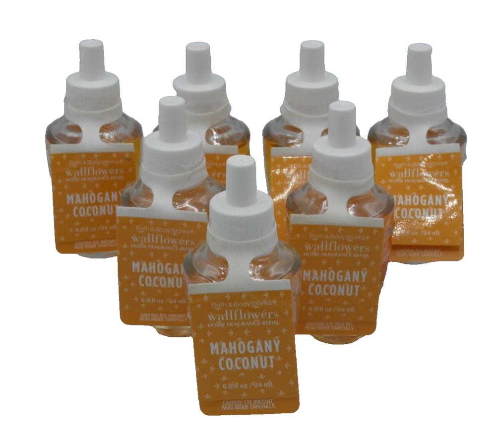 The Bath & Body Works MAHOGANY COCONUT WALLFLOWER REFILL BULB is a pack of 7 glass bulbs designed for wallflower plug-in air fresheners. Each bulb has a volume of .8 fl oz and is scented with a combination of mahogany and coconut. The bulbs are intended for use in a wall installation and are powered by a wall plug-in source. Mailing Address - We will ONLY ship to the address on file with eBay. This policy is in place for the protection of the buyer and seller. Before making a purchase, please ensure that your address is correct. We cannot change the address after purchase and will otherwise cancel the sale. Handling Time - Our handling time is set to THREE BUSINESS DAYS. We ship packages Monday - Friday, except on holidays . This listing is NOT sponsored by, affiliated with, or representative of the mentioned brand(s), trade name(s), or trademark(s) and does not claim any ownership of such. All trademarks or brands mentioned in this listing are registered trademarks of their original owners who reserve all their rights and ownership. The use or mention of any trade name, product name, or trademark is necessary for identification and is for reference purposes only.