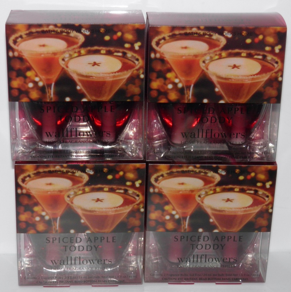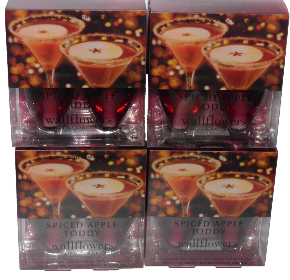 8 Bath Body Works SPICED APPLE TODDY WALLFLOWER FRAGRANCE REFILL BULB (4 X 2 PACK) 8 X BULBS TOTAL (4 X 2 PACKS) WALLFLOWER UNITS SOLD SEPARATELY NOTE: Returns are not accepted. Mailing Address - We cannot change the shipping address after purchase. This policy is in place for the protection of the buyer and seller. Before making a purchase, please ensure that your address is correct. We cannot change the address after purchase and will otherwise cancel the sale. Handling Time - Our handling time is set to THREE BUSINESS DAYS. We ship packages Monday - Friday, except on holidays . This listing is NOT sponsored by, affiliated with, or representative of the mentioned brand(s), trade name(s), or trademark(s) and does not claim any ownership of such. All trademarks or brands mentioned in this listing are registered trademarks of their original owners who reserve all their rights and ownership. The use or mention of any trade name, product name, or trademark is necessary for identification and is for reference purposes only