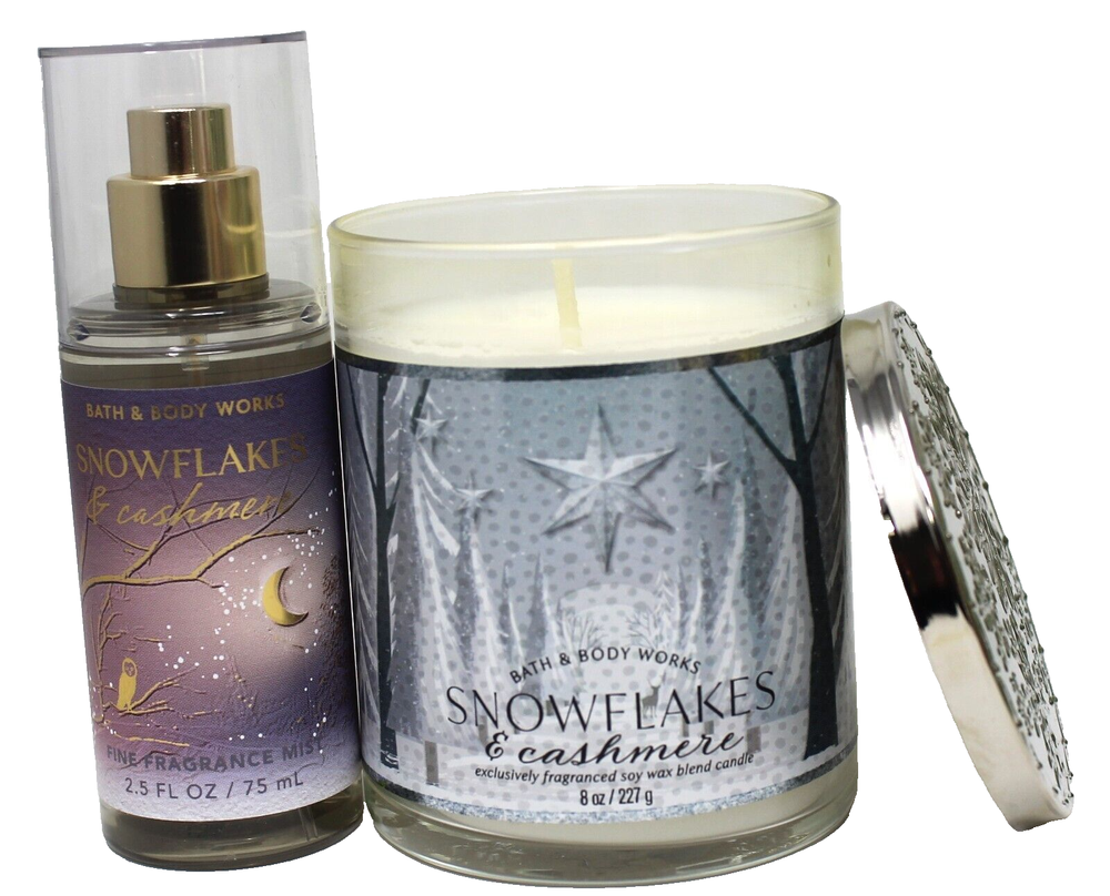 <div style="text-align:center"><img src="http://ti2.auctiva.com/sw/java.gif" border="0"><br><table align="center"><tr><td><a style="text-decoration:none" href="http://emporium.auctiva.com/Dimpl28" target="_blank"><img src="http://ti2.auctiva.com/sw/browse2.gif" border="0"></a></td><td height="21px" valign="middle" align="center"><font face="arial" size="2"><b><a href="http://emporium.auctiva.com/Dimpl28" target="_blank">Dimpl28</a> Store</b></font></td></tr></table></div> <img src="http://ti2.auctiva.com/web/aswCredit.gif" border="0"><br><a href="http://www.auctiva.com/?how=scLnk0" target="_blank"><img src="http://ti2.auctiva.com/images/sc1line0.gif" border="0"></a> Bath & Body Works Snowflakes & Cashmere Gift Set Candle 8 oz & Body Mist 2.5 oz We have been selling on eBay since 2002 and have always had a good standing with eBay due to our integrity. All our products are 100% authentic. To sell anything other than that is illegal and immoral. We do not ship internationally unless it's to a military address, in which case, we are honored to do so. All orders are double checked before shipping out to avoid any mistakes. We are honest and upfront about items and the condition of items. Once an item is purchased, the address cannot be changed nor can the order be canceled. Our handling time is 2 days, unless we’re out of town and then it will be changed to reflect any delay. Our customers make this business possible and I truly appreciate each & every one of you! Thank you!
