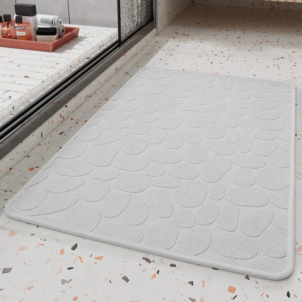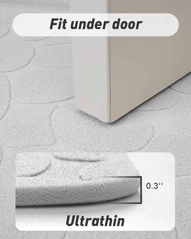 【Absorbent Cloth Top】The moment water pulls on the absorbent bath mat, it will be absorbent instantly without any drops stay on the surface, greatly reducing the possibility of accidently falling, water Absorption reaches 2 times of other fiber mats 【100% Odorless Non Slip Backing】Rubber backed bathroom rugs provide strong friction on wet slippery floors and prevent slipping and falling, especially for family with kids and elderlies, meanwhile, non slip bath mat prevents moisture from seeping into the floor and causing damage 【Thin Bath Mat】Our bathroom mat won’t get stuck under the door, 0.3 inches of thickness is perfect to stepping on, making the door easy to open and close, even in high traffic areas, the low pile bathroom rug won’t crumple and still fit tightly on the ground 【Machine Washable】Durable bath mats for bathroom floor can withstand multiple machine washes without falling apart, hang the bath mat to dry, the rubber back won’t crack 【Multi-Function Bath Rug】Soft cloth, keep you away from wet, ice cold bathroom floor, with an anti-slip rubber layer on the back of the super absorbing towels, our thin bathroom floor mat is both skid resistant and water absorbent