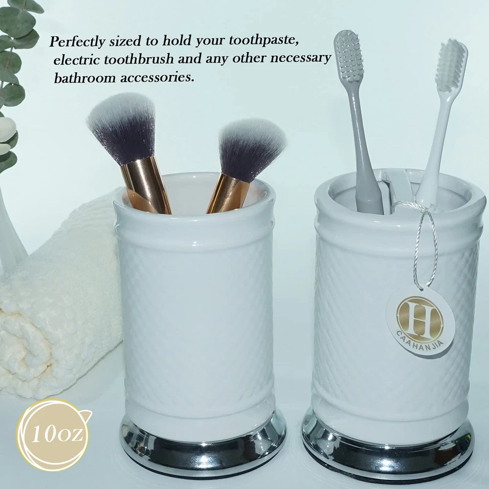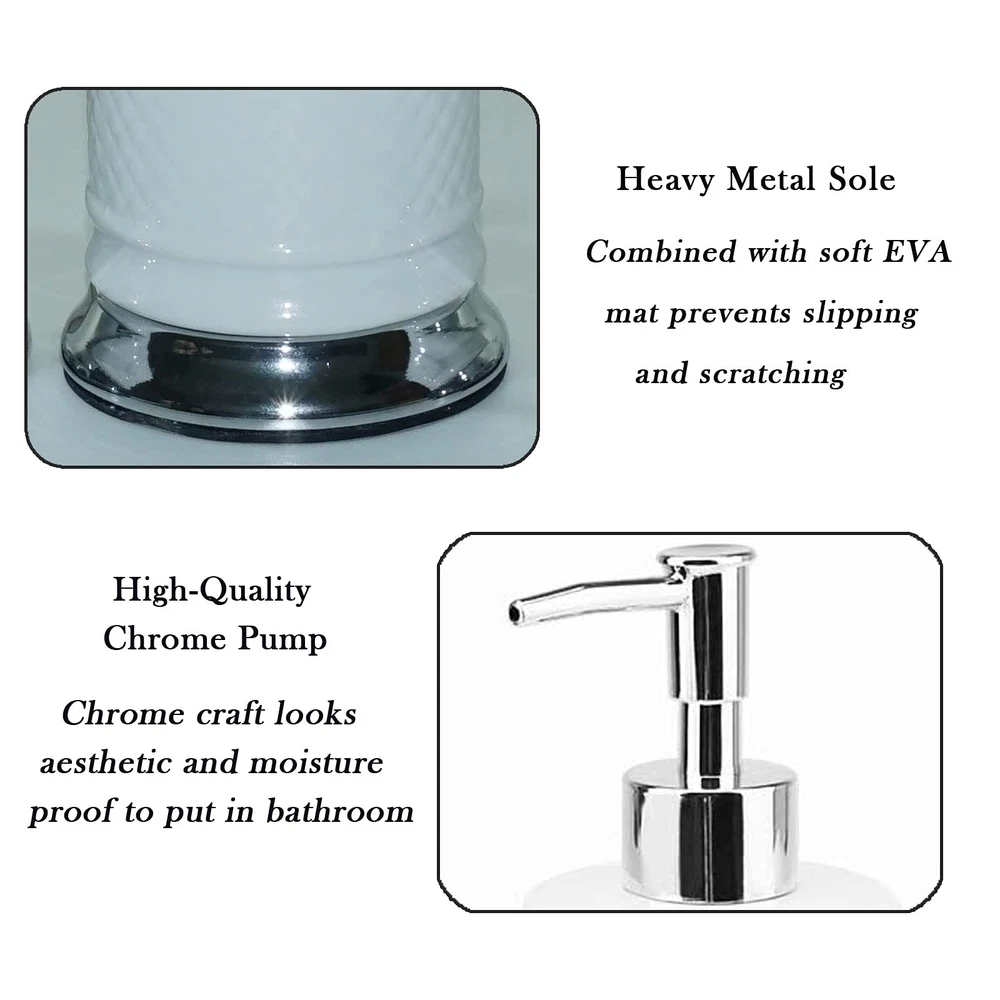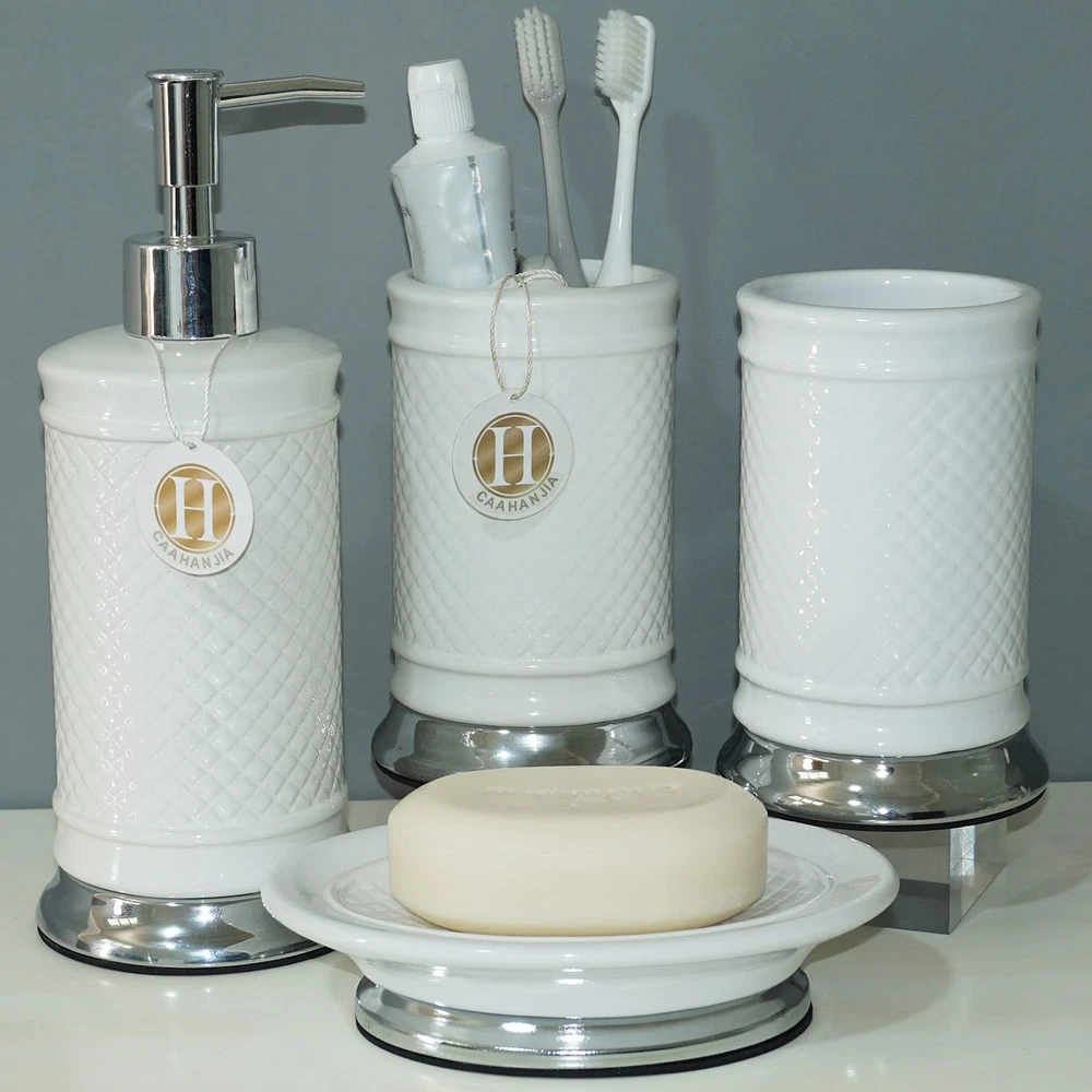 [Bathroom Set Material]: Ceramic bathroom accessories are made of high-quality porcelain clay and fired at high temperatures, which are safety, durable and easy-to-clean [Multi Functional]: Stylish design makes it ideal for modern bathrooms, this bathroom accessory set makes an attractive addition to any bathroom. It is suitable for homes, hotels, office buildings and other uses. [Bathroom Decoration Set]: Includes:1 lotion dispenser(ABS pump), 1 Toothbrush Holder, 1 tumbler cup, 1 soap dish [Great Gift]: As a perfect gift for your loved , family, friends and colleagues, it is the ideal choice for modern bathroom with its trendy design.