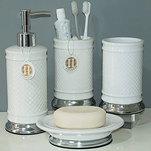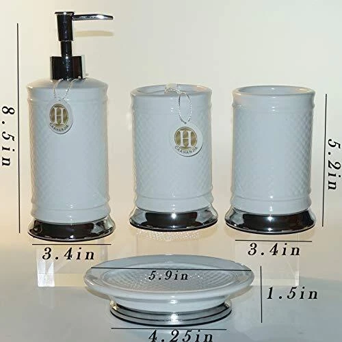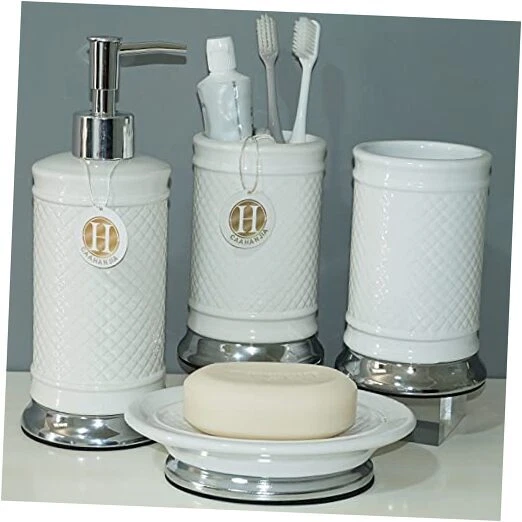 Return Policy Fast Delivery Trusted seller Bathroom Accessories Set 4 Pcs-Ceramic Gift Set Soap Dispenser Pump & Toothbrush Holder & Tumbler Cup & Soap Dish - Bathroom Home Decor Clearance, Countertop Vanity Organize (White03) Product Description Ceramic [Bathroom Set Material]: Ceramic bathroom accessories are made of high-quality porcelain clay and fired at high temperatures, which are safety, durable and easy-to-clean [Multi Functional]: Stylish design makes it ideal for modern bathrooms, this bathroom accessory set makes an attractive addition to any bathroom. It is suitable for homes, hotels, office buildings and other uses. [Bathroom Decoration Set]: Includes:1 lotion dispenser(ABS pump), 1 Toothbrush Holder, 1 tumbler cup, 1 soap dish [Great Gift]: As a perfect gift for your loved one, family, friends and colleagues, it is the ideal choice for modern bathroom with its trendy design. Shipping Returns Payment Shipping Shipping is FREE to all addresses other than APO/PO boxes in the lower 48 states. All our stock ships from US-based warehouses. Shipped via USPS or UPS (depending on location and package weight) Unless stated otherwise, all orders will ship within 24-72 hours of your payment being processed. Check our feedback to see the great reviews of FAST shipping we offer. Returns Seller does not accept returns Payment We currently accept payment via eBay managed payments only. Once payment is cleared, we will dispatch your shipment within 1-3 business days. Please refer to the "Shipping" tab for more information regarding shipping speed to your destination.