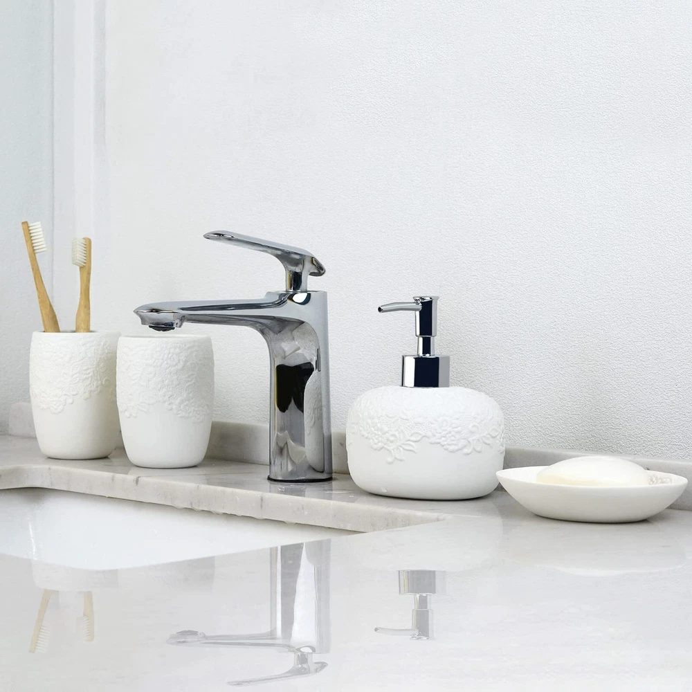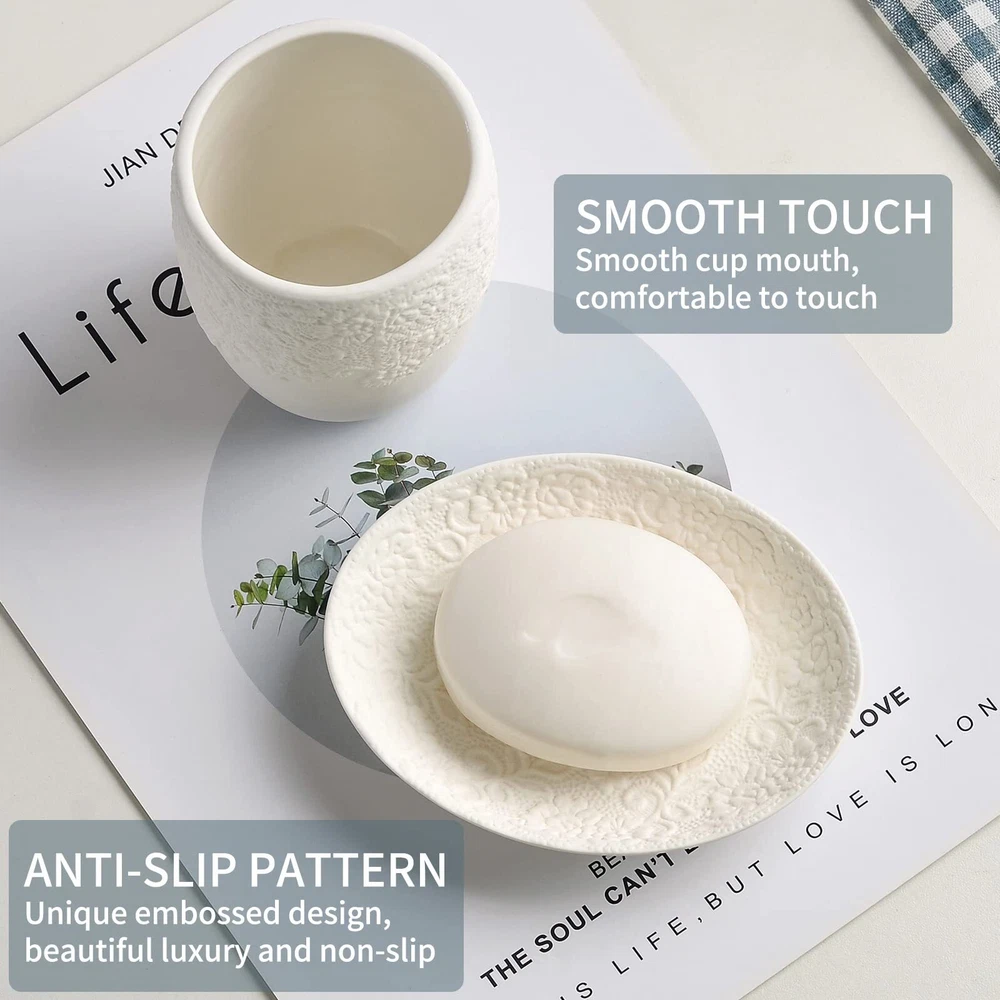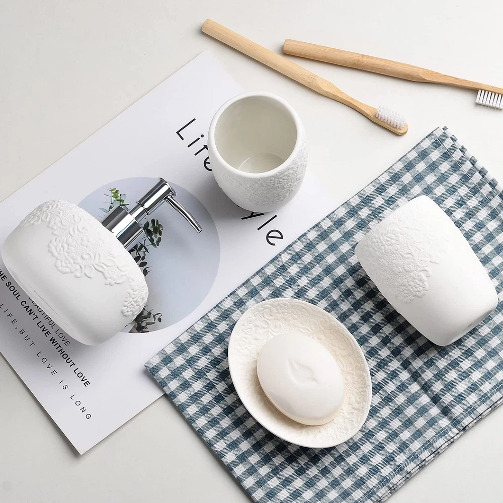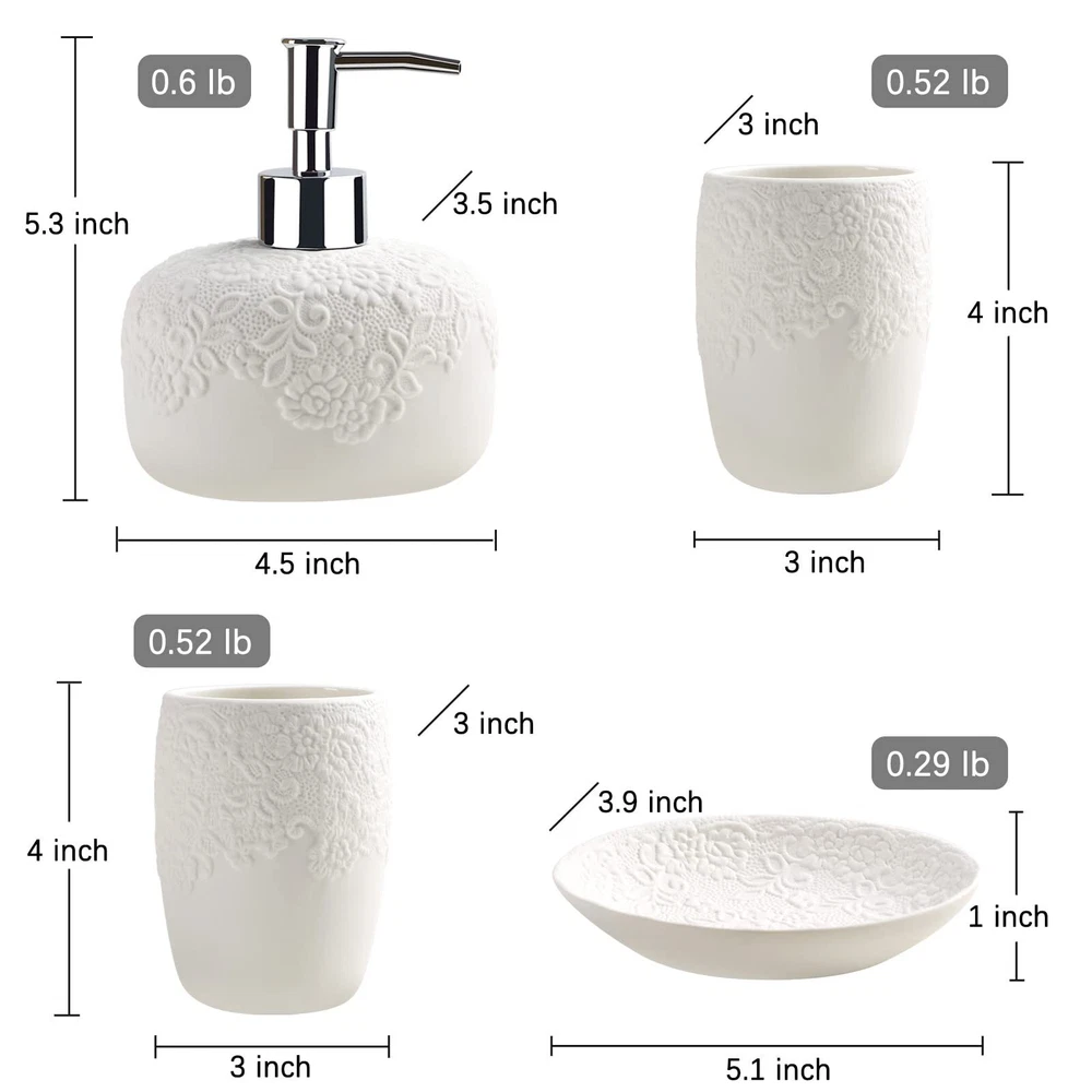 Bathroom Accessories Set with Embossed Design 4PCS, Ceramic White Bathroom Accessory Set, 1Pcs Bathroom Soap Dispenser 14oz, 2Pcs Tumbler Cup, 1Pcs Soap Dish, ANTIS'S HOME 【Embossed Design】This is a simple elegant bathroom accessory set. The matte finish is lovely and unique and the embossed pattern adds soft tone on tone texture without limiting the other decor one can pair with it. The floral design adds a beautiful touch to your decor. It will enhance the decor of any bathroom or powder room. 【Complete Bathroom Accessories Set】This is a complete bathroom accessory set that includes: 1pcs soap dispenser, 2pcs tumbler, 1pcs soap dish. Providing everything you need to keep your bathroom fully functional. 【Durable & Easy to Clean】The bathroom accessory set is made of high-quality ceramic material, durable and easy to clean, simply take a damp cloth or rinse under a stream of water and wipe clean. The inner lining of the tumblers is smooth and glossy, cleaning up is easy. 【A Perfect Gift Idea】Not only is our ceramic bathroom accessory set functional, but also makes for a great addition to any loved one’s home. This white ceramic bathroom accessories set will bring a distinctive visual delight to your bathroom, and it is a pretty gift for your wife and female friends. 【What You Get】 Bathroom Accessories Set 4PCS, our worry-free 24-month warranty, and friendly customer service. SHIPPING Domestic Buyers - We have confidence in our products, but if you are not fully satisfied please contact us within 30 days of purchase and you will get full refund. - We ship within 3 business days of payment, usually sooner - We offer FREE shipping on all orders! - We only ship to the lower 48 states, no APO/FPO addresses or PO Boxes allowed International buyers – please note: Import duties, taxes, and charges aren't included in the item price or postage cost. These charges are the buyer's responsibility. - Please check with your country's customs office to determine what these additional costs will be prior to bidding or buying. * Order Cancellation Policy ** You can return a product for up to 30 days from the date you purchased it. 1. The seller reserves the right to cancel the special case only due to eBay cancellation fee. 2. The decision of seller is the final. 3. The seller will respond to the cancellation request within 2 business days. Please wait for the result of cancellation. 4. In case the cancellation is not completed by some reasons, the buyer can follow the options below to get the refund. 4.1 The buyer can reject the item when it arrives. 4.2 The buyer can send the item back to the seller within 30 days If the buyer receives item (USA Shipment ONLY). The seller will provide the FREE return label to the buyer when the buyer opens " Return Item" case on eBay by using the reason as "Change my mind" ONLY. 5. When buyer has placed the order. The order will be processed and completed by automatic warehouse system within 5 minutes. In case that buyer sends the cancellation request after 5 minutes of placing the order, the request will be rejected. **Sending direct message to cancel the order is not allowed for every case.* Return Policy For the return case - If buyer would like to return the items for refund or replacement, please CONTACT SELLER to receive the free return label from seller. The refund or replacement will be processed with the tracking number of return label which is provided by seller only. The other ways of return which are not approved by seller will not be processed for the refund or replacement.