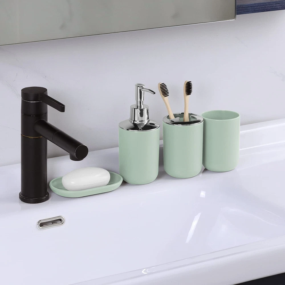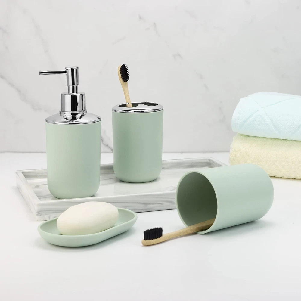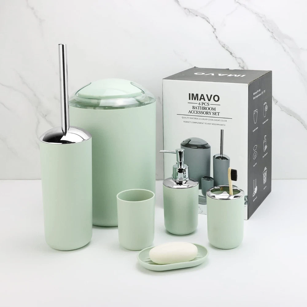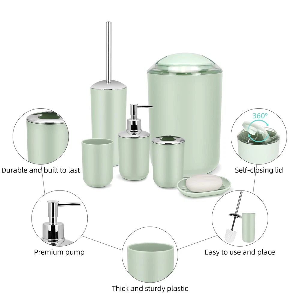 Complete Bathroom Accessory Set:Featuring a Toothbrush Holder,Toothbrush Cup,Soap Dispenser,Soap Dish,Trash Can,Toilet Brush & Holder,our bathroom accessories set ensures a unified and stylish bathroom aesthetic. Durable Design:Our Grey bathroom accessories set crafted from Durable and cleanable plastic, it effortlessly withstands daily wear and tear, ensuring long-lasting use. Space-Saving Design:Maximize your bathroom space with our compact and cleverly designed grey bathroom accessories set.Whether you have a small room or a spacious master bathroom, our bathroom accessories set offers smart storage solutions without taking up unnecessary space. Vibrant and Stylish:Add a pop of color and style to your bathroom with our vibrant and modern bathroom accessories set. they effortlessly enhance the aesthetics of your space while providing practical functionality. Versatile & Nice Gift:Our bathroom accessories set is a perfect fit for any space, whether it's your home bathroom, dorm, hotel, or RV. Its modern design effortlessly complements any bathroom, making it an ideal present for housewarmings or new homes.Whether it's for your family, friends, colleagues, or customers, this bathroom accessories set makes the nice gift.