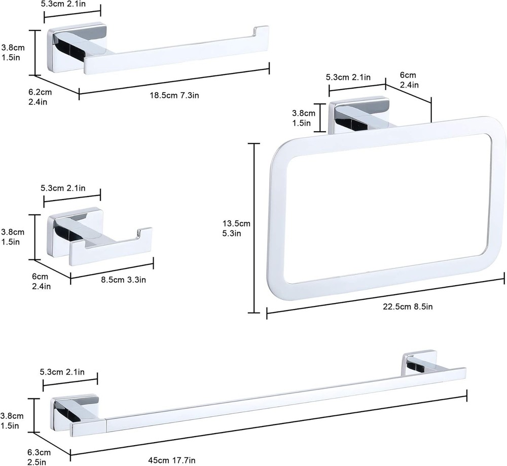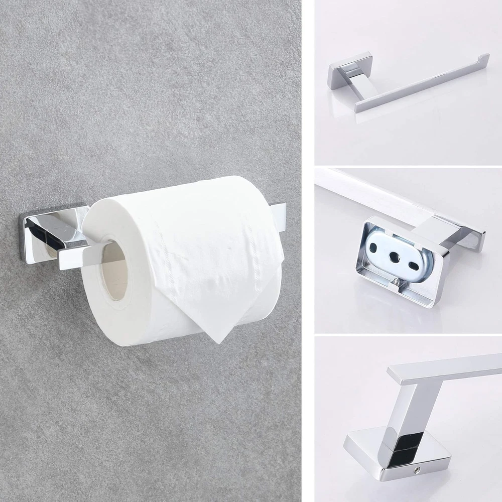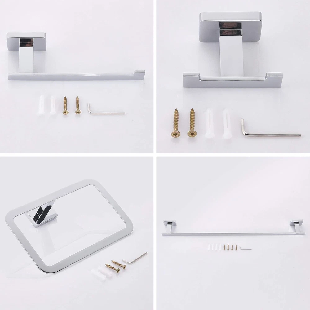 Stainless Steel 【PREMIUM 4-PIECE COMBINATION】The 4-piece bathroom hardware set for bathroom including robe towel hook, toilet paper holder, square towel ring, 18 inches towel bar.This Premium towel bar set combination will not make any products idle.They suitable for different style decoration. 【EXCELLENT MATERIAL】Bathroom hardware set made of 304 stainless steel and spray paint process.Prevent corrosion or discoloration, solid construction and durable. 【EASY TO INSTALL】We provide all the screw needed for installation in the package, There is no need to worry about how to install.Premium stainless steel screws and good quality anchors are concealed that makes the towel bar sets more attractive look.Make your bathroom,bedroom,kitchen more fashionable and tidy. 【ORGANIZE BATHROOM】Towel bar sets suitable for kitchen, bathroom, bedroom.Make your towels neat&organize your bathroom with stylish accessories to save more spaces,helps to reduce clutter in shower and bathrooms. 【NO RISK TO PURCHASE】If you are not satisfied with the bathroom hardware set. Please contact us.I will reply you within 24 hours and give you efficient after-sales service!