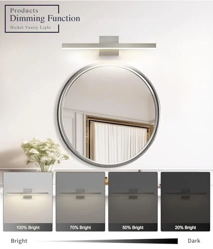 Return Policy Fast Delivery Trusted seller Bathroom Vanity Light Brushed Nickel Bathroom Light Fixtures Over Mirror 23.62 inch 5CCT Dimmable Modern Bathroom Lights Bar LED Vanity Lighting ETL Certificated Product Description 5 Color Changeable: Our brushed nickel vanity light for mirror is with 5 colors temperature according to your actual need, t is a SHIFT key on the side of the vanity lights base, and freely choose soft white/warm white/cool white/Day light temperature to meet your mood Dimmable Function: Vanity lighting fixtures with ETL certificated dimmable driver ensure the bathroom lamp to 5%-100% dimming range, the vanity light bar compatible with most household triac LED dimmers for smooth and flicker-free operation.you can switch the mirror lights freely to the dimming range Energy Saving And Easy Installation: integrated Led light source 18W modern bathroom light, voltage: 110V / 120V. LED technology saves up to 80% electricity compare to conventional light bulbs and lifespan up to 30,000 hours. Easy to instal the bathroom lighting fixtures over mirror just connect to the reserved wire directly Durable Vanity Light: Bathroom vanity light is made of metal material and white acrylic cover, with anti-corrosion, anti-rust, waterproof and dustproof ability Wide Application: Perfect for you indoor bathroom fixtures as vanity lights for mirror, dressing table mirror lights for makeup, led lights for bathroom cabinet, restroom lights for vanity mirror , powder room wall light fixture etc Shipping Returns Payment Shipping Shipping is FREE to all addresses other than APO/PO boxes in the lower 48 states. All our stock ships from US-based warehouses. Shipped via USPS or UPS (depending on location and package weight) Unless stated otherwise, all orders will ship within 24-72 hours of your payment being processed. Check our feedback to see the great reviews of FAST shipping we offer. Returns Seller does not accept returns Payment We currently accept payment via eBay managed payments only. Once payment is cleared, we will dispatch your shipment within 1-3 business days. Please refer to the "Shipping" tab for more information regarding shipping speed to your destination.