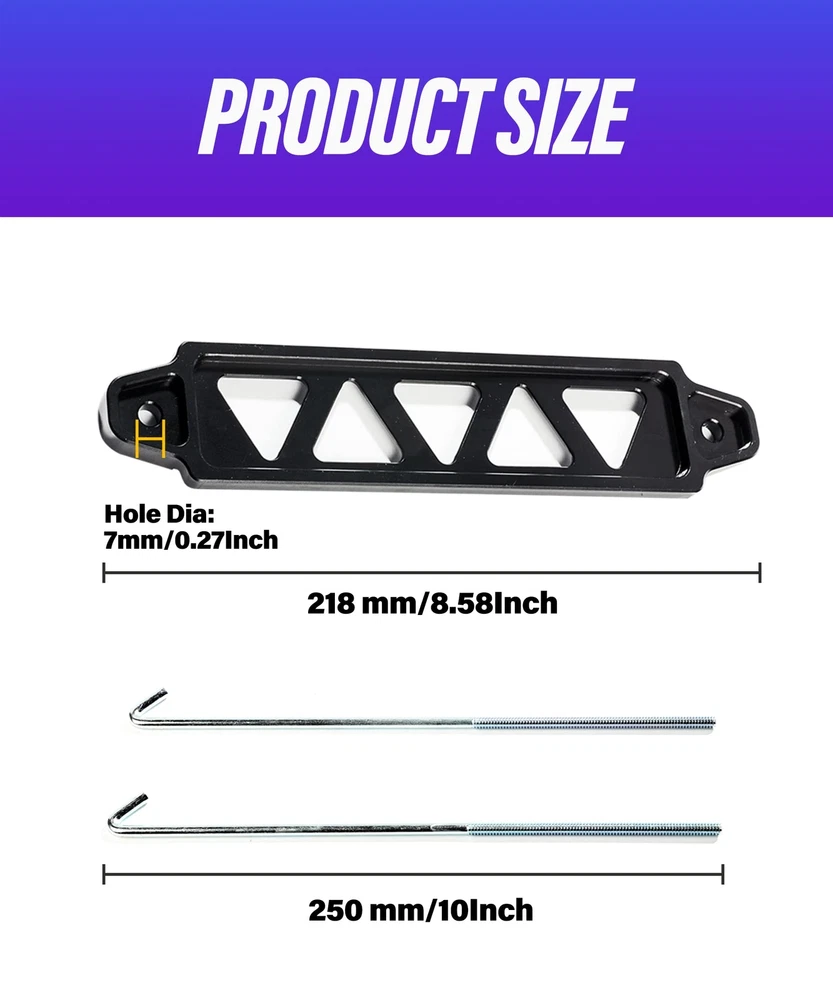 Battery Hold Down Bracket Holder [Package Includes] The package includes 1 battery mounting bracket, 2 10 inch J-shaped hooks, 2 sets of accessories (suitable for different installation types) -2 hexagonal and wing nuts, 2 rubber protective sleeves, 2 protective rubber washers, 2 spring lock washers, and 2 flat washers. [High Quality] The battery mounting bracket is made of high-quality aluminum alloy, which is sturdy, rust proof, and antioxidant. The side is designed with thickened aluminum alloy, which enhances the corrosion resistance and durability of the product. The surface of the bracket has undergone anodizing treatment, providing a long-lasting finish. [Size] The total length of this battery mounting bracket is 8.58 inches, and the distance between bolt centers is 7.48 inches. The bolt length is 250 millimeters and 10 inches. Please measure the diameter of the primary battery before purchasing to avoid purchasing products with incorrect dimensions. [Applicable] The battery fixing kit for automobiles is usually suitable for most groups 21, 21R, 22F, 22HF, 22R, 24, 24F, 24H, 24R, 24T, 25, 26, 26R, 26/70 27, 27F, 27H, 28, 29H, 30H, 31, 31A, 31T, 33, 34, 34R, 34/78, 35, 40R, 41, 42, 43, 46, 47, H6 (48), H8 (49), 85, 86, 90, 91, 92, 93, 94R, 95R, 96R, 97R, 98R, 99, 124, and 140R batteries. (Reminder: This type of fastening device is not suitable for some battery surfaces between raised ventilation caps) [Function] The battery fixing device aims to ensure that the battery is firmly fixed, with multiple colors available for selection, adding a beautiful and clean appearance to the engine compartment.