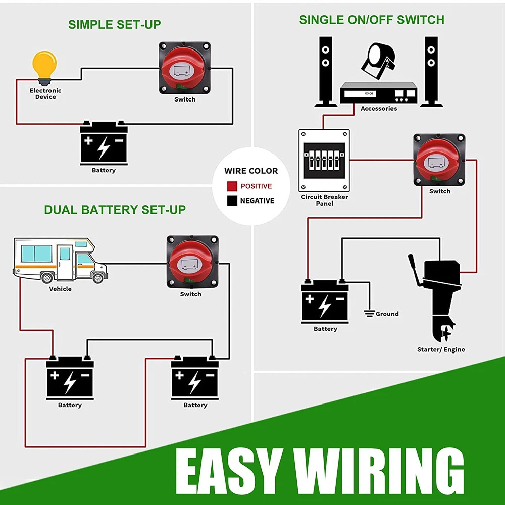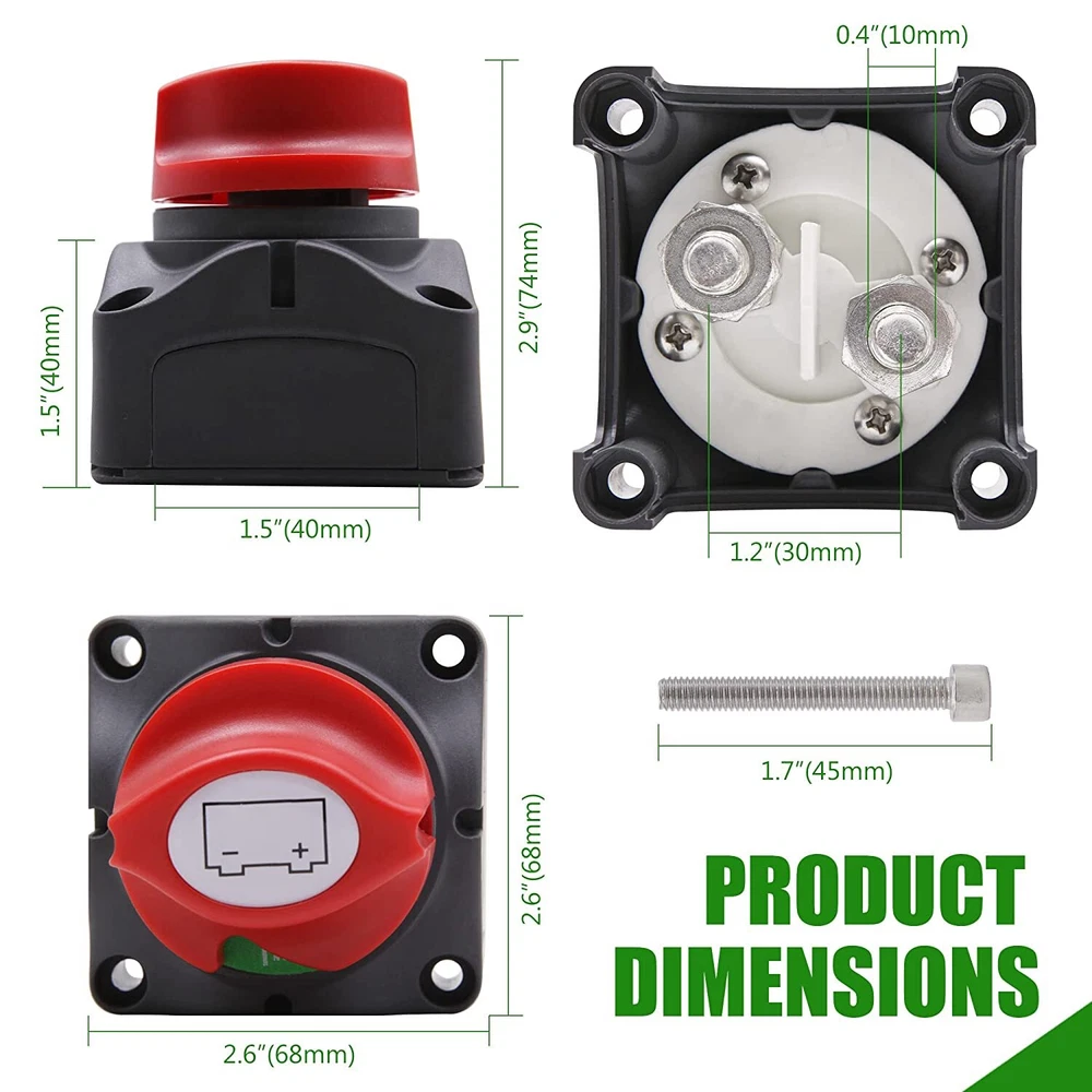 Specifications: Selector Position: ON - OFF Voltage: 0V - 60V DC Rating: 275 Amps Continuous, 1250 Amps Intermittent Base: 2.85" x 2.85" (72.5mm x 72.5mm) Height: 2.90" (73.5mm) Terminal studs: 10mm diameter. Features: - Easy to install - Comprehensive wiring diagram and installation. - Ignition protected - Safe for installation aboard gasoline powered boats or vehicles. - Make before break contact design allows switching between battery banks without power interruption. - Offers a simple economic way of separating battery. - Heavy-duty design, High-quality. - Widely used for Car, Marine, Boat, RV, Camper, Truck, ATV, UTV, Battery banks and other 0-60V Devices. Package include: 1 x Battery Switch 4 x Side Pads 4 x Mounting Bolts Description: 1. ABS plastic housing, durable made for safety use. 2. Rear cover insulates terminals against any short of circuits. 3. On/Off 2 positions. 4. Copper terminal studs with nuts and washers. 5. 4 mounting screw holes. 6. 300 A continuous at DC 12V, 1000 A momentary at DC 12V. 7. Used for DC 12 - 48V systems to isolate and secure the electrical system. 8. Can stand alone or be locked together with other switch. 9. Eliminate any power draw from the battery when vehicle or boat is not in use. 10. Disconnects the battery safely. 11. Universal used for Car, Truck, Vehicle, Motorcycle, RV, Marine, Boat, ATV and UTV. 12. Used as electrical equipment's switch.