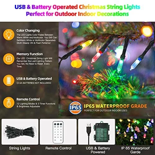 Menu 1. We require immediate payment. 2. We currently accept payment via eBay managed payments only. 3. Once payment is cleared, we will dispatch your shipment within 1-3 business days. Please refer to the "Shipping" tab for more information regarding shipping speed to your destination. Battery Operated Christmas Tree Lights with Remote Memory Timer Function, 33ft 100LED USB Christmas Lights 12 Lighting Modes for Christmas Outdoor Indoor Decor (Warm White to Multicolor) Product description 【Color Changing Christmas String Lights with MEMORY FUNCTION】Our upgraded Christmas lights color can fade between warm white and multicolor. You still can set warm white or multicolor separately (Both STEADY ON & FLASH Patterns) for variety of holidays or occasions. Our led Christmas lights with memory function will remember the last lighting patterns you set, no need to reset every time. 【REMOTE CONTROL & 12 MODES】Our 33FT 100 LED green wire string lights with remote control to modify 12 lighting patterns, set the timer and adjust brightness as well as turn on and off. Simply press the button on the battery box to select 12 lighting setting from COMB, Warm White Steady ON, Multicolor Steady ON, Color Cycle, Mixed Colors 1, Mixed Colors 2, Slo-Glo, Breathing, Warm White Slo-Glo, Multicolor Slo-Glo, Flash, In Wave. 【BATTERY POWERED & SUPPORT USB CHARGING】Our battery operated Christmas lights, 2 in 1 powered style, support USB or Battery powered (3xAA size, NOT INCLUDED). No wiring required, portable, easy to put or hang on wall, window, door, wrench, garland, tree, fence and anyw for decoration. 【DIMMABLE & 3 TIMER FUNCTIONS STRING LIGHTS】Our string lights with 4 levels brightness for various needs:100%, 75%, 50%, 25%. 3 Timer Functions: ①6H (6 Hours ON & 18 Hours OFF ) ;②8H(8 Hours ON & 16 Hours OFF);③ 6639H(6 Hours ON, 6 Hours OFF, 3 Hours ON, 9 Hours OFF). The timer allow you to keep the lights ON or OFF each day automatically to free your hands and avoid forgetting to turn off the lights. 【INDOOR OUTDOOR WATERPROOF CHRISTMAS LIGHTS】IP65 waterproof battery box and string lights, great for outdoor indoor decor, add charming glow to your garden, patio, lawn, porch, gate, yard, bedroom, home, kitchen decoration. PLEASE MESSAGE US IF YOU HAVE ANY OTHER QUESTIONS, AND MANY THANKS FOR READING ALL OF THIS. Copyright ©#. All Rights Reserved.