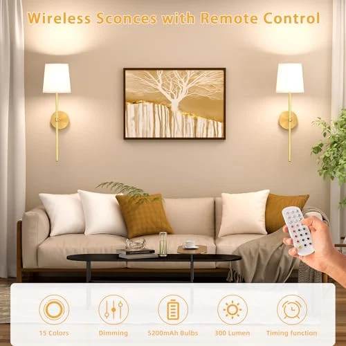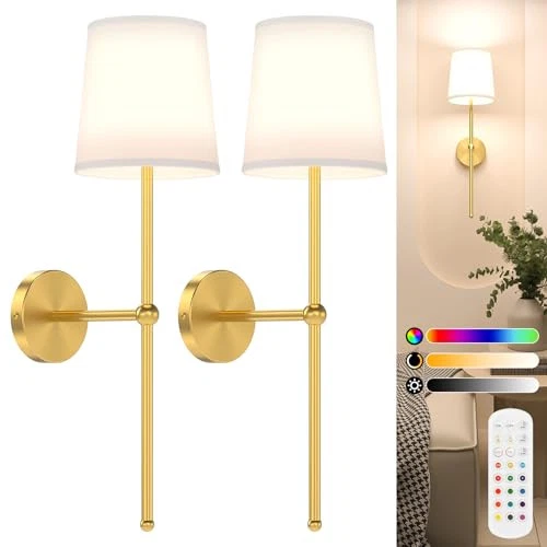 Return Policy Fast Delivery Trusted seller Battery Operated Wall Sconce Set of 2, Gold Wireless Wall Lights with Remote, 15 Colors Dimmable Wall Lamp, 5200mAh Rechargeable Sconces for Bedroom Living Room Bathroom Hallway Product Description Sconces Wall Decor Set of Two:White lampshade and gold bracket, simple and versatile, perfect for enhancing your space. Placed on the living room, game room, hallway, bedroom, or next to the bathroom mirror, these wall lamps make your life more stylish Non Hardwired Wall Sconces Set:The cordless wall sconce lights are battery-powered, no wiring required for installation, no need to change your wires, just drill holes according to the instructions, and you can quickly install these wireless lamps Battery Operated Wall Lights:The battery powered lamp features a 5200 mAh E26 rechargeable light bulb with a USB-C charging wire. It takes 3-4 hours to fully charge and can use for 25 hours at maximum brightness, or 72 hours at the lowest setting Dimmable & Color Customized:The wireless lamp with three adjustable color temperatures (3000K, 4500K, 6000K) and ten levels of brightness adjustment (10%-100%). Additionally, t are 12 RGB colors and 2 flash modes to meet your different needs Timing Function: This rechargeable wall sconce has a timing function, you can set the lights to turn off automatically after 30/60/120 minutes, which will help battery sconce reduce unnecessary power consumption, and extend the life of the battery Two Ways to Control: The battery wall lamp with remote control makes your life easier. Alternatively, you can also control the wireless sconces by pressing the button on the bulb: a single press to change the mode, and a long press to turn off the lamp Shipping Returns Payment Shipping Shipping is FREE to all addresses other than APO/PO boxes in the lower 48 states. All our stock ships from US-based warehouses. Shipped via USPS or UPS (depending on location and package weight) Unless stated otherwise, all orders will ship within 24-72 hours of your payment being processed. Check our feedback to see the great reviews of FAST shipping we offer. Returns Seller does not accept returns Payment We currently accept payment via eBay managed payments only. Once payment is cleared, we will dispatch your shipment within 1-3 business days. Please refer to the "Shipping" tab for more information regarding shipping speed to your destination.