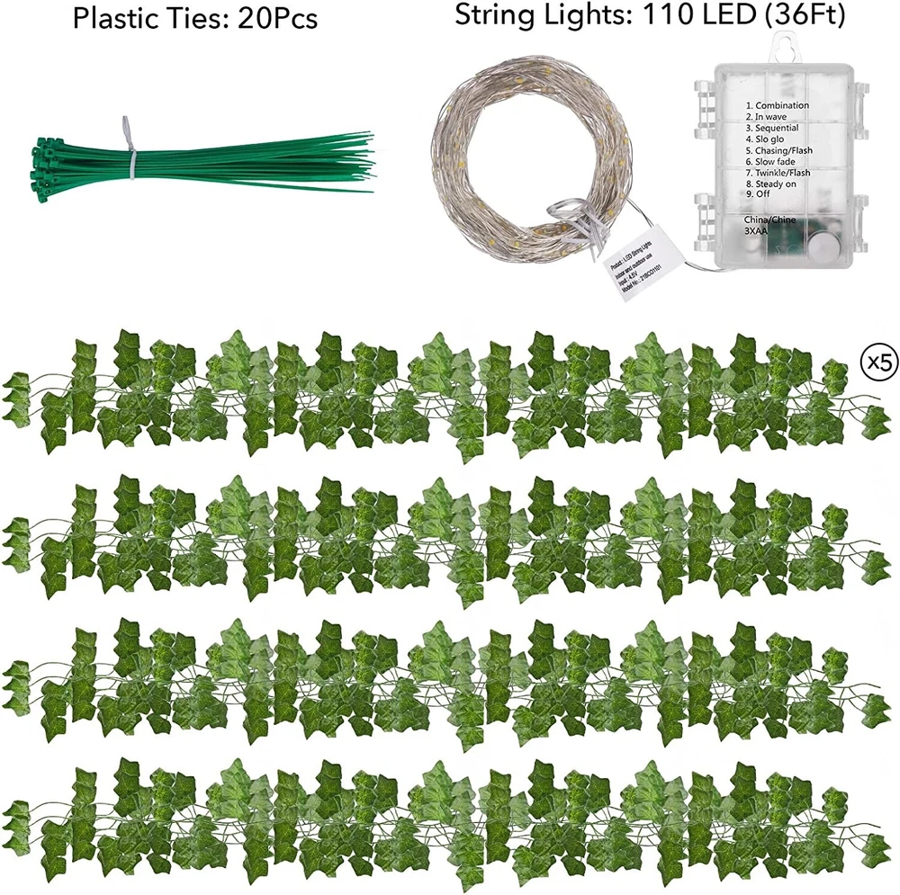 - Minetom 36 Ft. String Lights with Vines Battery Operated 12 Pcs 7 Ft. Artificial Ivy Vine 110 LED Vine Lights 8 Modes Ivy Lights for Bedroom Room Wall Wedding Indoor Party Festival Decor (Warm White) - Color: Warm White Brand: Minetom Indoor/Outdoor Usage: Indoor Special Feature: Waterproof, Energy Efficient Light Source Type: LED Power Source: Battery Powered Light Color: White, Warm White Occasion: Wedding, Party, Evening Party, Christmas, Birthday Style: 110Led Lights Material: Plastic, Copper About this item Seasonal Decor: 36 feet 110 LED ivy string lights for room decorations, coming with gift box, a grace present expected for family, friends, relatives, colleagues, teen girls or yourself in this beautiful season Vivid Effects: 8 lighting modes available from this ivy fairy lights, 1. combination(mode 2 to 7 cycling), 2. in waves 3.sequential 4.slow glow 5.chasing and flash 6.slow fade 7.twinkle and flash 8. steady on Controller Box: 3 AA size batteries needed for operating this vine Controller Box: 3 AA size batteries needed for operating this vine lights, 8 shaped hanging hole for screwing up, hooking or plastic ties, repeatedly pressing the mode button to power on, off or switch desired working mode Easy Hanging: 20 pieces of cable ties included for freely hanging the battery box or tying the vine decor, nice accessories for dorm, window, living room, patio, hallway, porch, balcony, pergola, corridor, banister, pavilion, fence, tent, shelf, hotel, birthday party, evening party, BBQ, ball, disco, bistro, pub, cafe or office Friendly Tips: It is normal that there will be some unpleasant odor generating from your fake ivy vines which packing in a enclosed box for long time, unpack and place it in a dry open area to release the plastic odor for a while Minetom 110 LED artificial ivy string lights Why choose us? ● 36 ft. string lights with 12 pcs 7 ft. vines can better decorate the environment, embellish the atmosphere and increase the romantic feeling. ● Portable – Battery powered Christmas fairy lights also can be used as portable tent lighting while camping. ● Our artificial ivy lights can be widely used for room decor, bedroom decor, wall décor, ivy costume, safari jungle theme party, wedding and farmhouse decoration, especially for girls, boys. Technical Details Color Warm White Brand Minetom Indoor/Outdoor Usage Indoor Special Feature Waterproof, Energy Efficient Light Source Type LED Power Source Battery Powered Light Color White, Warm White Occasion Wedding, Party, Evening Party, Christmas, Birthday Style 110Led Lights Material Plastic, Copper Controller Type Button Control Number of Light Sources 110 Voltage 4 Volts Wattage 3 watts Included Components Artificial Ivy, LED Item Weight 11.1 Ounces Item Package Quantity 1 Control Method Remote Manufacturer Minetom Part Number String-lights-110LED Item Weight 11.1 ounces Package Dimensions 6.85 x 5.59 x 4.02 inches Item model number String-lights-110LED Special Features Waterproof, Energy Efficient Batteries Included? No Batteries Required? No