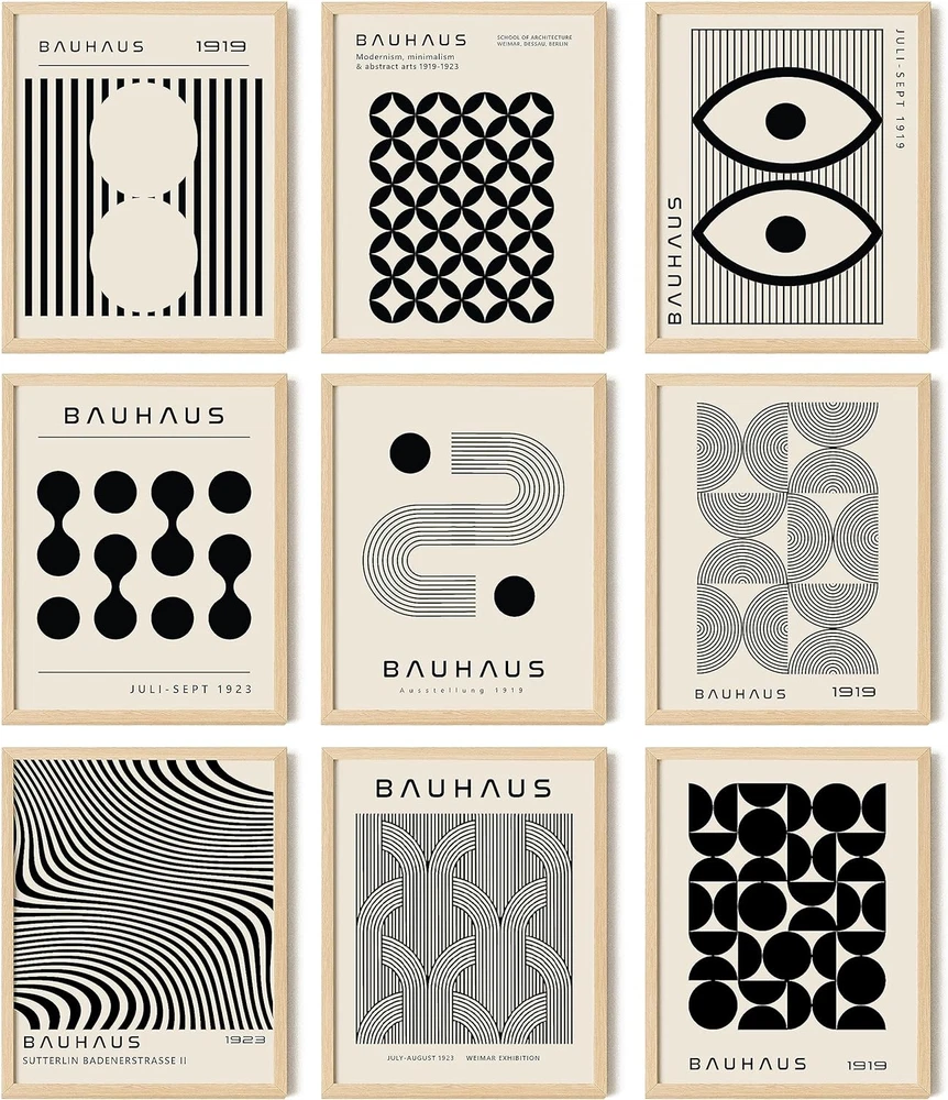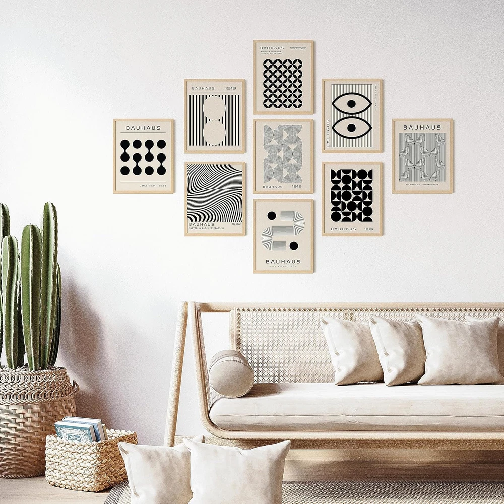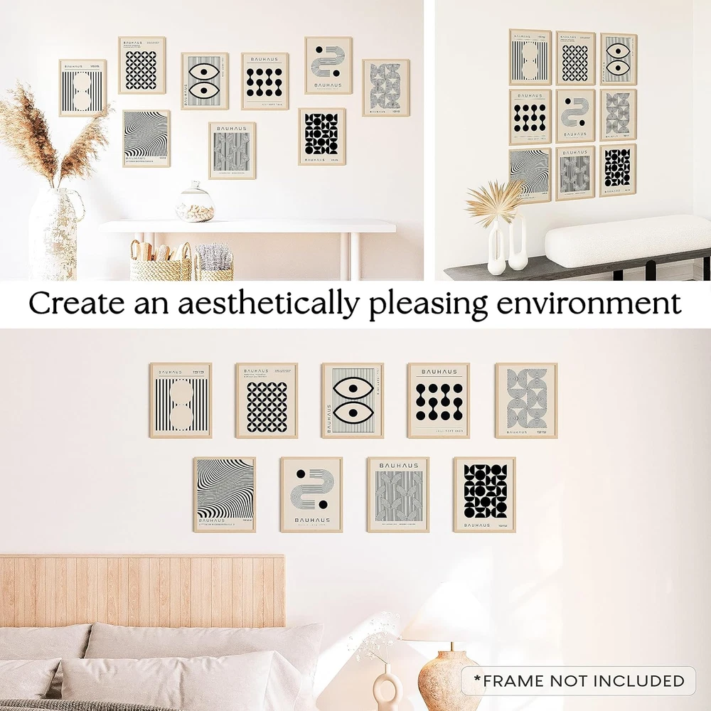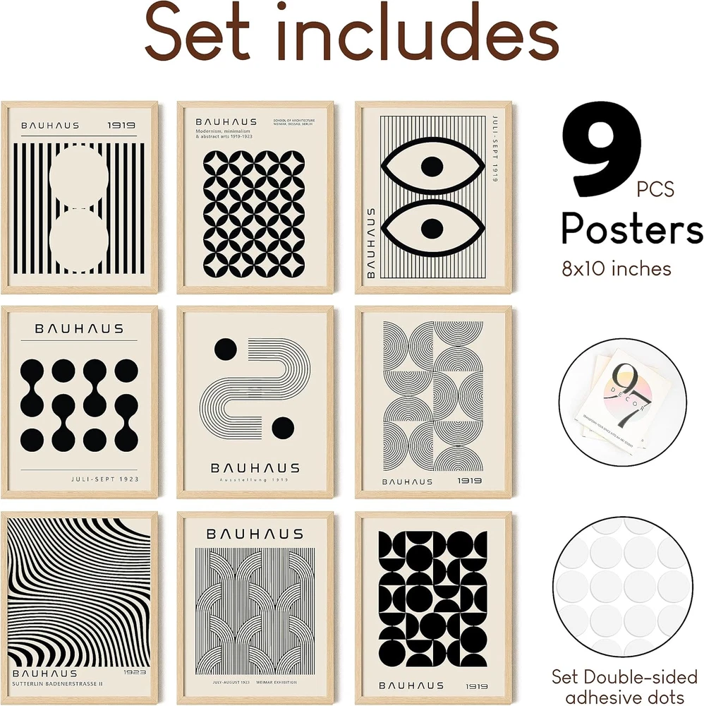 MID CENTURY DECOR: Add some geometric flair to your space with our Geometric Shapes Poster. This stylish piece of geometric decor features bold black lines and clean shapes that will add a touch of modernity to any room BAUHAUS WALL ART; Add a touch of contemporary style to your home with our Black and White Abstract Wall Art. This minimalist and modern Bauhaus poster features a striking design that will add a touch of sophistication to any room SET INCLUDES: You'll receive 9 Bauhaus Art Print Set 8x10" (UNFRAMED) and plenty of glue dots to hang this ideal black geometric wall decor PERFECT GIFTS: Our Mid Century Modern Wall Art is a perfect gift for those who love vintage style. This Bauhaus wall art set features a collection of contemporary paintings that capture the essence of black white Bauhaus HIGH-QUALITY GEOMETRIC ART PRINT: Printed on thick cardstock papers, our contemporary painting wall art ensures a premium feel and a long-lasting finish spiral parabolas art CAREFUL PACKAGING: These pictures are packaged in a sturdy gift box, ensuring the product's quality when delivered to you Product Description