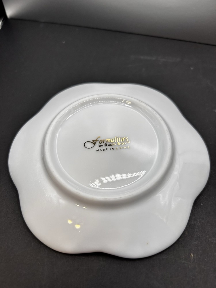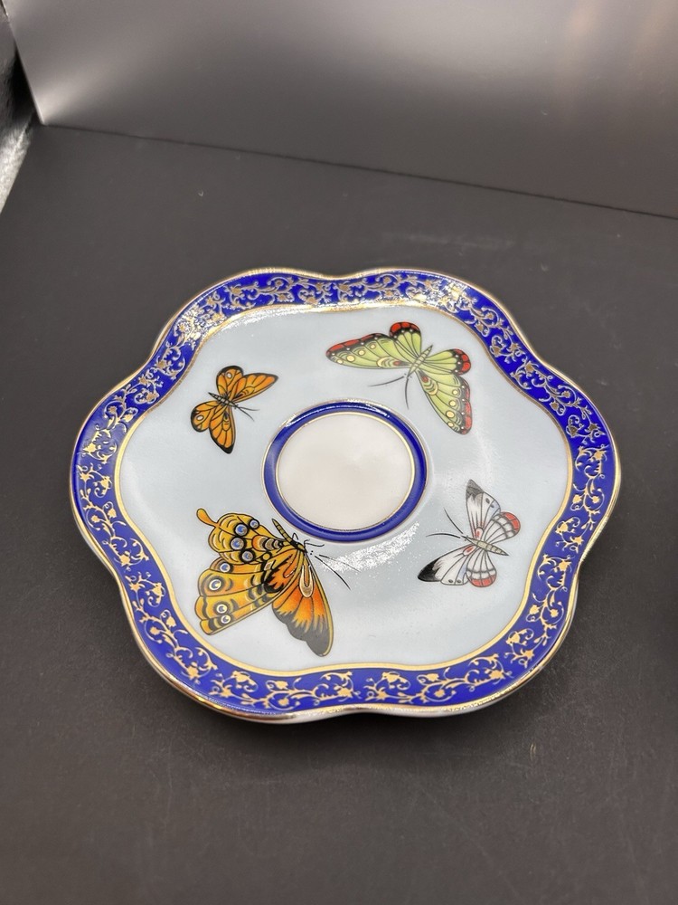 The Formalities By Baum Brothers Butterfly Teacup and Saucer set features a charming design with purple and gold trim, accented with butterflies. Made of ceramic and porcelain, this two-piece set is perfect for all occasions and can be used for both hot and cold beverages. The vintage set is hand wash only and made by the brand Baum Brothers, known for their delicate painted designs. The round teacup and saucer set includes a decorative floral theme and is a beautiful addition to any tea lover's collection.