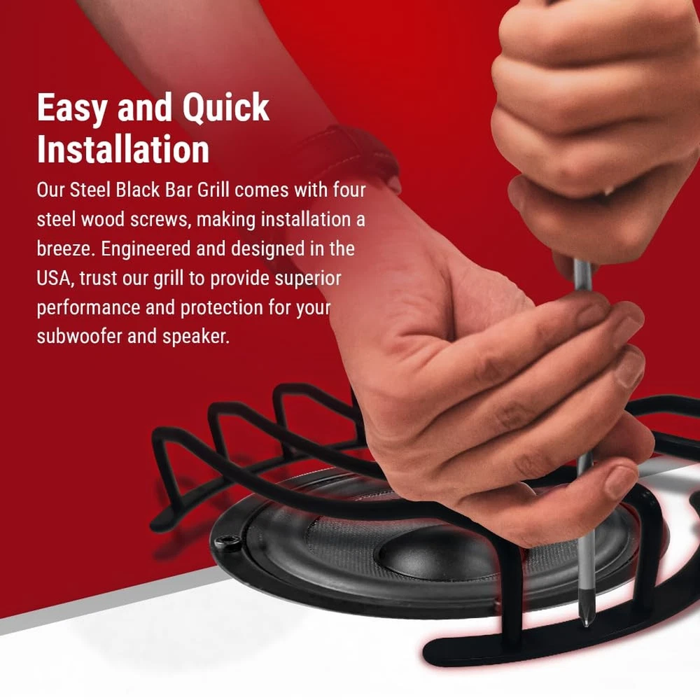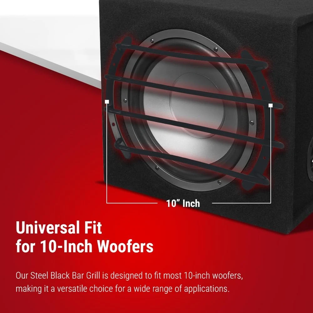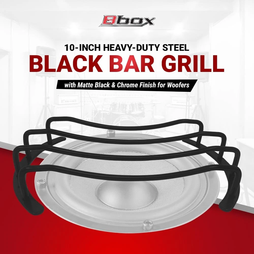 Bbox 10-inch Heavy-Duty Steel Black Bar Grill with Matte Black & Chrome Finish for Woofers - Fully Welded and Ready to Install with Screws - Engineered and Designed in The USA with 1.625" Clearance Product Details Style: SINGLE Size: 10" Brand: Bbox MPN: S10-GB UPC: 636644603811 EAN: 0636644603811 Brand: Bbox Audio Output Mode: Stereo Material: Steel Model Name: S10-GB Speaker Type: Subwoofer Special Feature: Durable Recommended Uses For Product: construction Compatible Devices: Car Stereo, Car Amplifier Subwoofer Diameter: 10 Inches Color: BLACK Included Components: Speaker Box Product Dimensions: 10"D x 6"W x 2"H Is Waterproof: FALSE Number of Items: 1 Control Method: Touch Speaker Size: 10 Inches Power Source: Corded Electric Vehicle Service Type: Car Water Resistance Level: Not Water Resistant Package Type: Standard Packaging Subwoofer Connectivity Technology: Wired Includes MP3 player?: No Specific Uses For Product: construction UPC: 636644603811 Style: SINGLE Global Trade Identification Number: 11 Manufacturer: Bbox Item Weight: 1.54 pounds Country of Origin: China Item model number: S10-GB Is Discontinued By Manufacturer: No Date First Available: August 1, 2016 DURABLE HEAVY-DUTY STEEL CONSTRUCTION: Made of de-burred tube steel, our grill is robust and long-lasting, ensuring maximum protection for your speaker and subwoofer. UNIVERSAL FIT FOR 10-INCH WOOFERS: Our Steel Black Bar Grill is designed to fit most 10-inch woofers, making it a versatile choice for a wide range of applications. LARGE SURROUND COMPATIBILITY: With raised ends, our grill provides extra space for larger surrounds, guaranteeing your subwoofer is fully protected from potential damage. OPTIMAL CLEARANCE: Boasting 1.625 inches of clearance above the woofer, our grill offers ample space for your speaker to breathe, resulting in optimal sound quality. EASY AND QUICK INSTALLATION: Our Steel Black Bar Grill comes with four steel wood screws, making installation a breeze. Engineered and designed in the USA, trust our grill to provide superior performance and protection for your subwoofer and speaker. Description: Upgrade your audio setup with the Steel Black Bar Grill, providing maximum protection for your subwoofer and speaker. Constructed with heavy-duty de-burred tube steel, this grill is made to last. The raised ends of the grill allow for extra-large surrounds, compatible with most 10-inch woofers. With 1.625 inches of clearance above the woofer, this grill provides optimal sound quality, while the sleek matte black and chrome silver finish adds sophistication to your setup. Fully welded and ready to install, this grill includes four steel wood screws for quick and easy installation. Its versatile design makes it suitable for home theatres, car audio systems, and professional sound studios. Measuring 12.3125 inches overall, this Steel Black Bar Grill is designed and engineered in the USA, ensuring exceptional performance and protection for your investment. Enhance your audio experience with the Steel Black Bar Grill today."