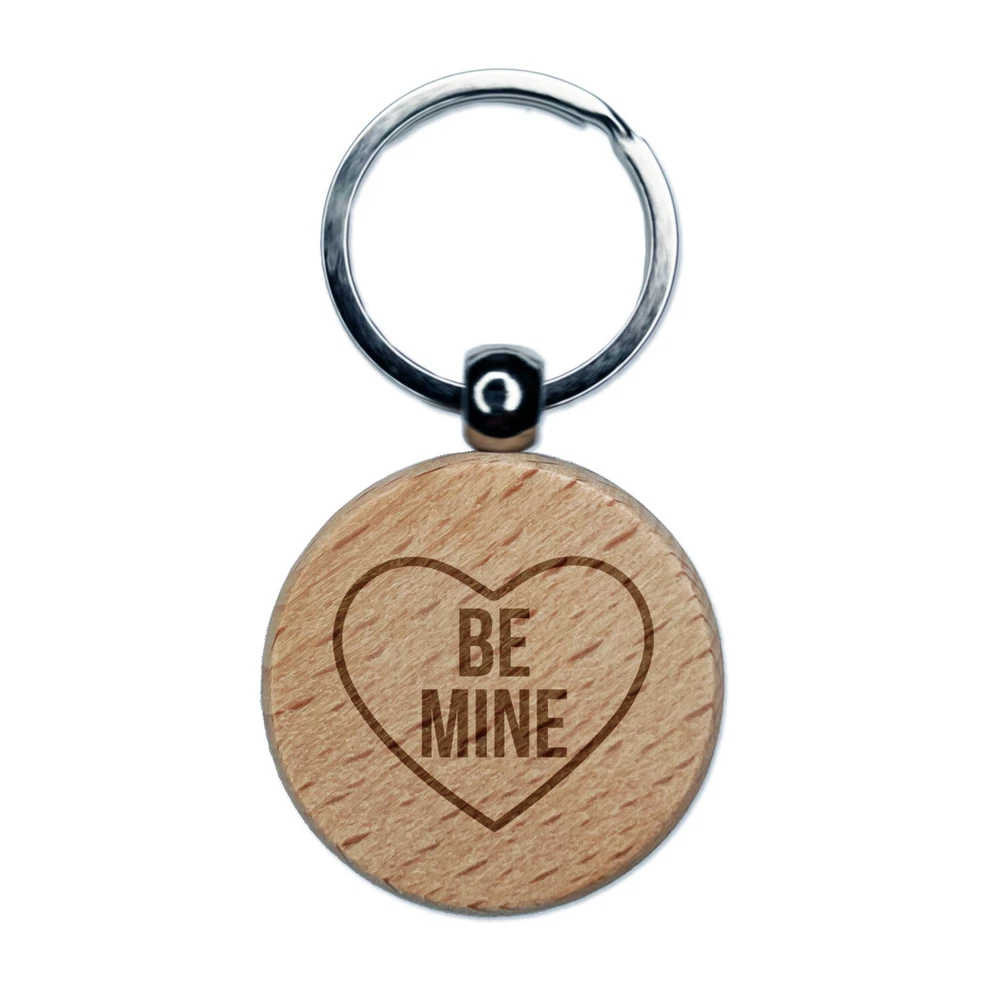 Be Mine in Heart Love Valentine's Day Engraved Wood Round Keychain Tag Charm