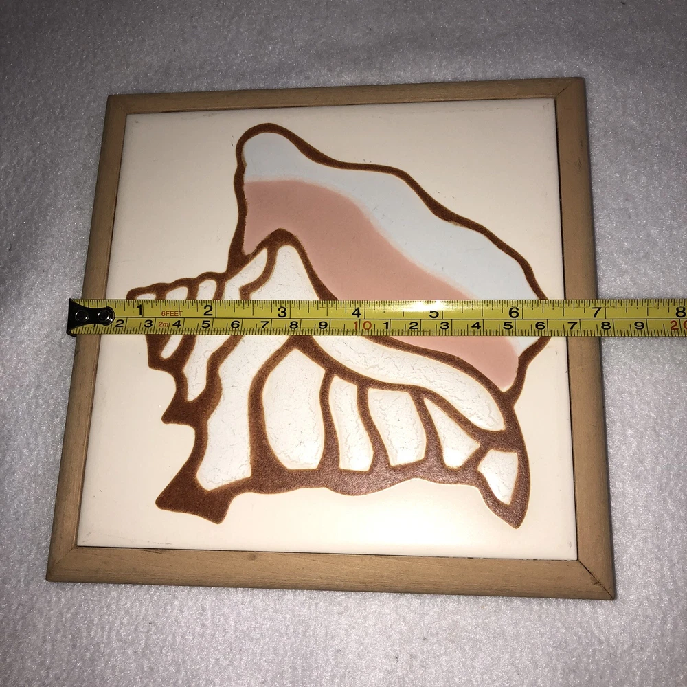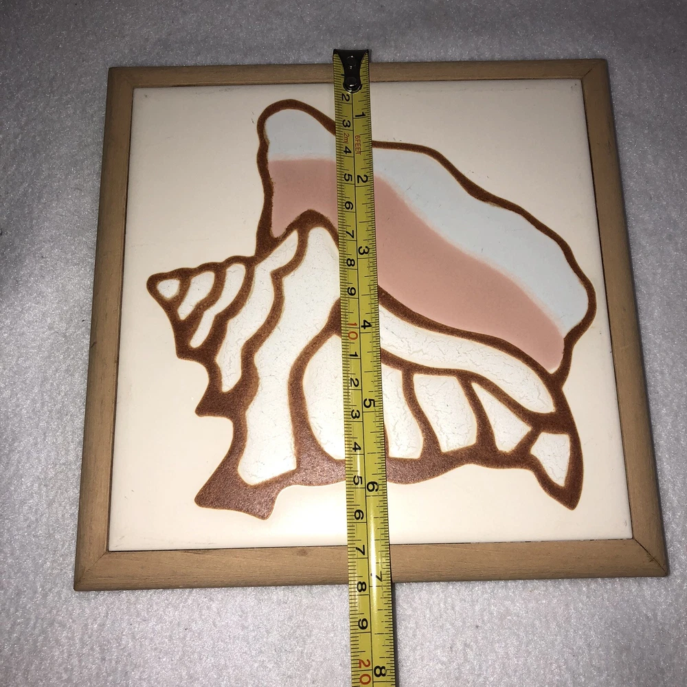 This is a beautiful Tile Art Originals by Jane Tallman of Miami Florida tile trivet. It has a Beach theme and features a Conch Shell. It is done in soft earth tone colors of beige, tan, white and pink. The trivet is encased in a wood frame. Could be used either as a wall hanging or as a hot plate/trivet. There is a hook on the back for hanging. It measures approximately 7 inches by 7 inches. Trivet is in good pre-owned condition. There are no nicks, chips or cracks. One of the small round cork feet is missing. Tile Art Originals sticker is still in place on the back side of the trivet. Please review all photos for additional details, views and measurements. Shipped via USPS Ground Advantage.