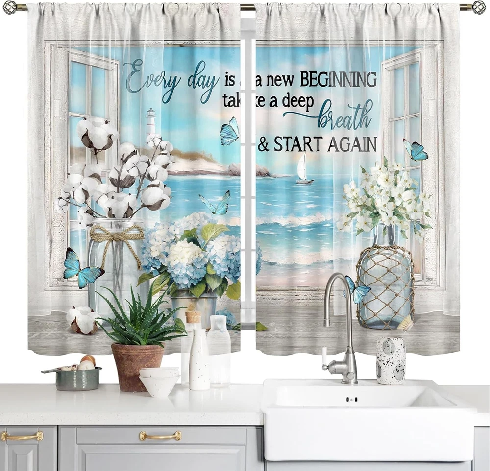 ��Light Filtering Kitchen Curtains�� Kitchen Curtains Set 100% Premium Polyester, Without Chemical Coating, Perfect Light Filtering, Innovative Soft And Durable Wrinkle Resistant Material, Good Abrasion Resistance And Drapability. The Curtains Block The Sun, Protecting The Furniture In Your Home. ��Farmhouse Design�� This Kitchen Curtains Farmhouse Style Using High-Definition Printing Technology, With Bright And Rich Colors. Soft And Smooth Classic Pattern, Suitable For The Kitchen Room Modern Or Retro Vintage Style Decoration. ��Ready Made�� The Beach Flower Short Curtains For Windows Includes 2 Panels Curtains, Each Panel Measuring 26"W X 36"L, 28"W X 39"L. Easy To Install And Slide. Rod Pocket Construct Fits Most Rods In The Market. ��Multi-Purpose�� Samll Window Curtains Home Decor Items Are Suitable For Your Kitchen, Living Room, Dining Room, Bathroom, Cafe, Outdoor Patio, Door,Kids And Dorms With High Performance In Room Darkning, Efficiency And Privacy Protection. ��Easy Care�� The Short Curtains For Windows Are Easy To Clean And Can Be Hand Or Machine Washed Without Worrying About Fading Or Needing Ironing. Material Is Wrinkle Resistant, Please Iron At Low Temperature If Needed.