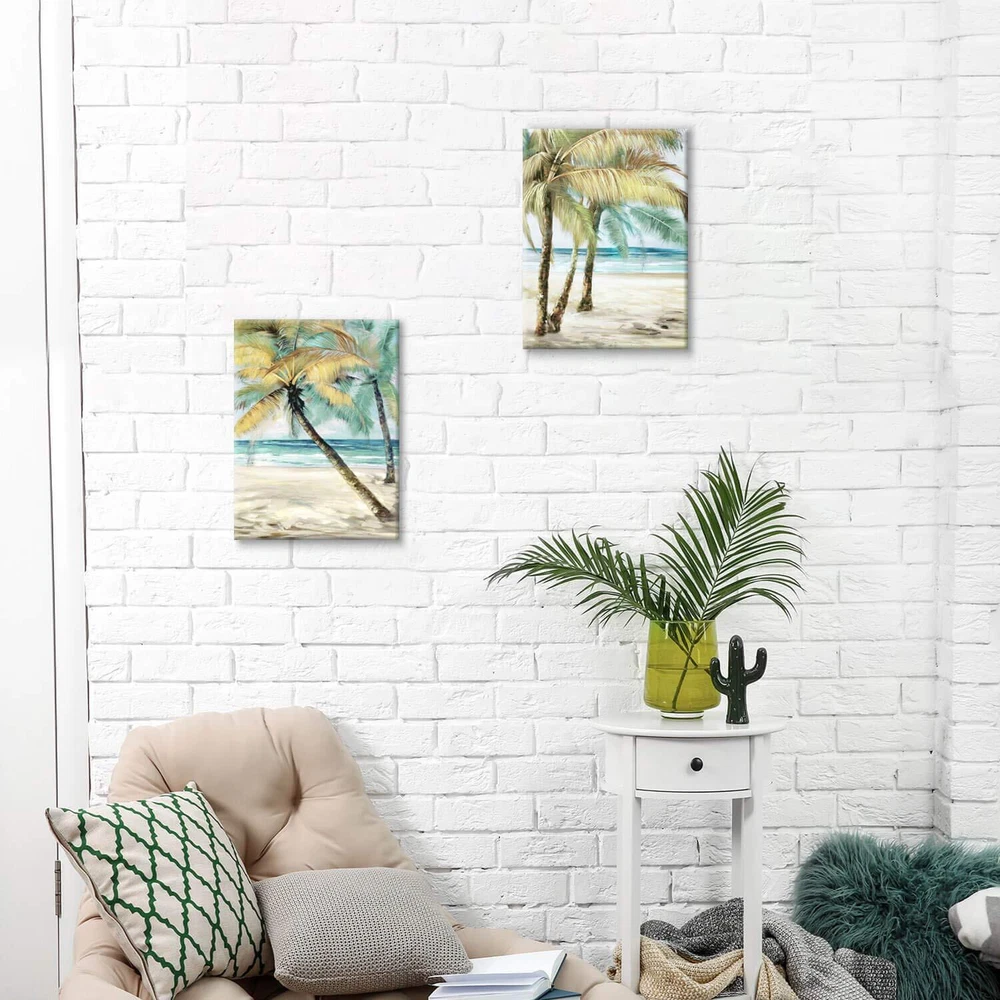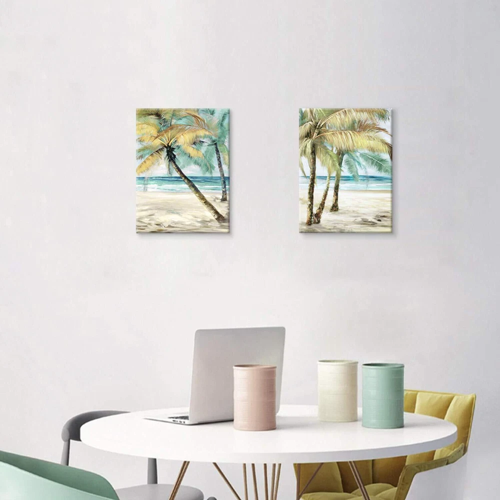 This palm tree canvas wall art brings a little elements of the relaxing tropical beach to your room. When tired or stressed-out, look at the peaceful coast and the palm trees on your wall, place your mind on the calming picture to breath the salty ocean air. Abstract Palm Tree Wall Art: The palm trees on beach painting makes a perfect gift for Christmas, Mother's Day, holidays, anniversaries, birthdays and any other occasions. Palm Tree Picture on Canvas: This is an ideal addition for any bathroom, vanity, master bathroom, kids bathroom, guest suite, laundry room, spa, kitchen, vacation home, hotel bathroom. 3D Wall Art Palm Trees: Museum-quality art print is printed by fade-resistant archival ink. Giclee printmaking technology makes the palm tree print wall art virtually identical from the original. Professionally hand wrapped around sustainable wooden frame for durability and stability. Tropical Beach Palm Trees Wall Art: Easy to hang right out of the box, this palm tree paintings on canvas includes free hanging accessories for a quick and easy-to-hang process. Gently use a soft cloth to remove dust from the canvas when needed. Do not clean palm tree pictures wall art with any type of liquids. Please be aware that actual colors on the canvas may vary a little from those shown on your screen. Palm tree pictures, palm tree painting, palm tree art, pictures of palm trees, grey palm tree wall art, wall art palm trees, palm tree picture, palm trees pictures, picture of palm trees. Ocean Palm Trees Wall Art: Hanging the abstract beach wall art on your wall, let the green palm trees on the beach take your heart to outdoors and give yourself a Temporary escape from the busy life, bringing some kind of peace and beauty to your own space Beach Palm Tree Pictures for Wall: Take this palm tree canvas wall art as a perfect gift for yourself or someone special on important days, and you will get so many compliments on the tropical beach wall art Canvas Palm Tree Wall Art: High-resolution giclee printing on museum premium canvas with high quality fade resistant ink and gallery-wrapped, this palm tree print wall art makes your room look like a artistic gallery Prints Wall Art Palm Trees: Wall-mounting accessories included, the palm tree artwork picture is ready to hang right out of the box for effortless installation Palm Tree Canvas Painting: A set includes 2 panels. Wipe the 2 panel palm tree canvas with dry cloth only. Copyright licensed image with high resolution definition