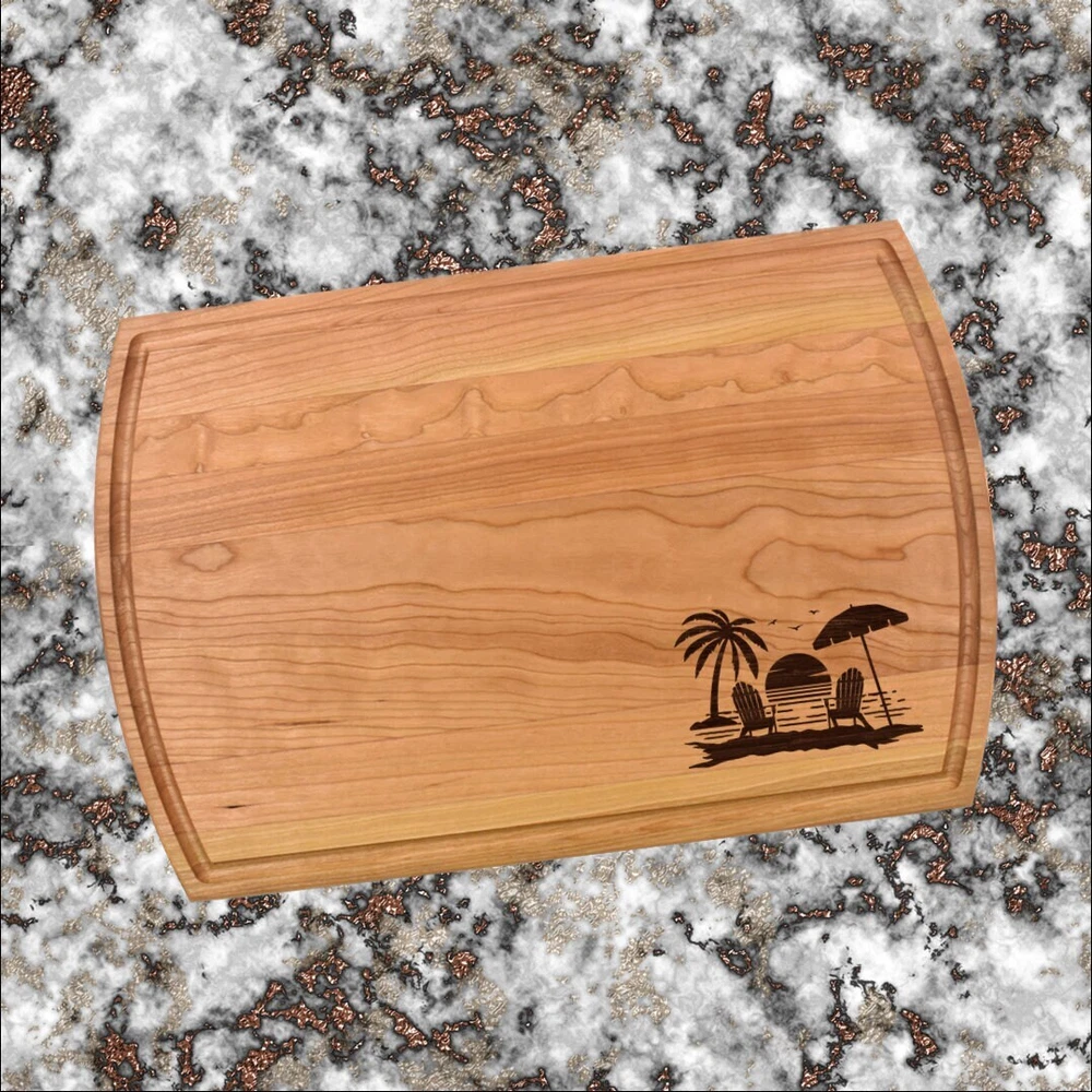 Design: Personalized Paradise Beach Scene Cutting Board or Charcuterie Serving Tray All items ship via USPS - please make sure your address is correct :-) Whether used as a charcuterie serving tray for snacks or cutting board, our bamboo, walnut and cherry custom boards are the perfect addition for the home and make the perfect gift for your loved one celebrating a birthday, anniversary, new home, wedding, etc! *** FEATURES *** • SIZES: We have multiple styles and sizes available. To see our current sizes available, click the drop-down menu. The photo slide contains a photo showing each side by side. Please note, the board with the juice groove only has the groove on the front side of the board. • THICKNESS: Bamboo Boards - Approximately 1/2" Thick; Walnut & Cherry Boards - Approximately 3/4” Thick • UNIQUE: Every board is unique with the grain and coloring varying throughout - no board is the same! • CARE INSTRUCTIONS: Hand wash only with warm water. Do not soak. Please apply mineral oil throughout the board’s life. • PERSONALIZATION/CUSTIMIZATION: Do you want the text placed differently on the board? Please don’t hesitate to contact us. All personalization notes can be entered in the personalization box when checking out. • SHIPPING: All cutting boards ship within 2 to 5 business days. • WHOLESALE ORDERS: Please don’t hesitate to contact us for information about wholesale orders. Processing times for larger orders may change. • NOTE: Colors can vary a bit on different monitors and screens. Any props included in photos are not included. Please be sure to double-check your address to make sure it is accurate for USPS delivery. If a package is returned to us due to an invalid address, the buyer is responsible for all additional shipping charges. We appreciate you supporting small business – best wishes! For items ordered with simple edits, we do not send proofs since the layout doesn't change from the example(s). However, in the event there are requests that change the layout from the example(s), we do send proofs for approval before making the product. If you'd like a proof before we make the product, please note so in the personalization box.