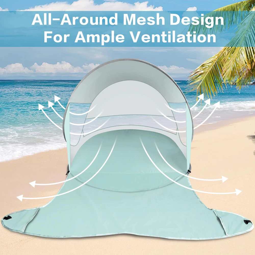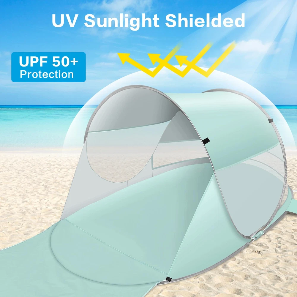 Portable & Larger Space: This beach tent is assembled in two parts and extended front floor provides extra space for more activities. The open size of sun shelter is 98 x 47 x 37 inches (L x W x H), comfortably fits 3—4 people. Lightweight at 4 lbs, packs down to 24" x 1" inches, easy to take down and fold back under 30 seconds, no need spending time & energy to build it up. pop up tent is the best choice to travel with. 360° Ventilation: Three large mesh windows with spacious entrance are enlarged to help air flow and widen your vision, allowing you to enjoy the sea breeze and playtime comfortably inside the beach shade. Excellent UV Protection: Beach shelter tent with eco-friendly silver coating that can be effectively blocks up to 98% of the sun's harmful UV rays, which providing all-day protection for you and your family. Water/wind-proof design makes it suitable for all your outdoor activities. Premium Material for Stability: The beach canopy sunshade is made of 190T polyester for long lasting performance, strong frame, not easily deformed and cracked, all while supporting the beach shelter tent securely, allowing it to stand by itself and keeps shape after long time use. 4 sand bags and 10 stakes are provided, allowing to form a stable structure with the sun tent, which further enhances the stability. Widely Use: Automatic instant tent is suitable for many occasions, it is not only appropriate to be used at the beach, but also perfect fit any activities at the park, backyard, fishing, playground, playgroups, sporting events, music festivals, weekend trip or children playhouse. The perfect ideas for birthday parties, picnics, carnivals and sleepovers.