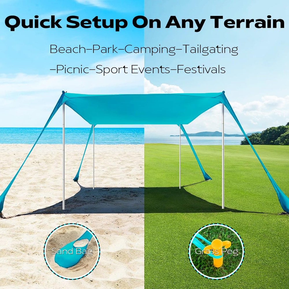 【Large Size Beach Canopy】- beach tent sun shelter is 10x 10 ft, with 4 aluminum poles up to 6.6 ft in height, which can hold up to 8 people for beach party or outdoor picnic. Your home base will become the most coveted spot on the entire beach 【Quick and Easy Setup】- Beach shade canopy can be set up by a single person within 5 minutes. Simply lay it flat, fill the bags with sand, pull the bags apart to make a large "X," and prop up your tent with 2-4 poles 【Portable and Lightweight】- Weights 8 lbs and comes with a long-lasting nylon travel bag. Whether you're flying to a coastal paradise, camping, or fishing trips, you'll have no problem packing your pop up beach tent 【Advanced Sun Protection】- Designed with the high stretch Lycra fabric and offering UPF 50+ sun coverage and water-resistant function, lightweight beach tent pop up shade can shade your outdoor beach holiday. Family beach tent durable materials are not afraid of stretching and tearing 【Stable Windproof Performance】- Fill the sandbag with sand or stones as much as possible which makes this portable beach canopy has better wind resistance. You use beach shade tent over sandy beaches, thick grassy areas, or even in rocky camping spots