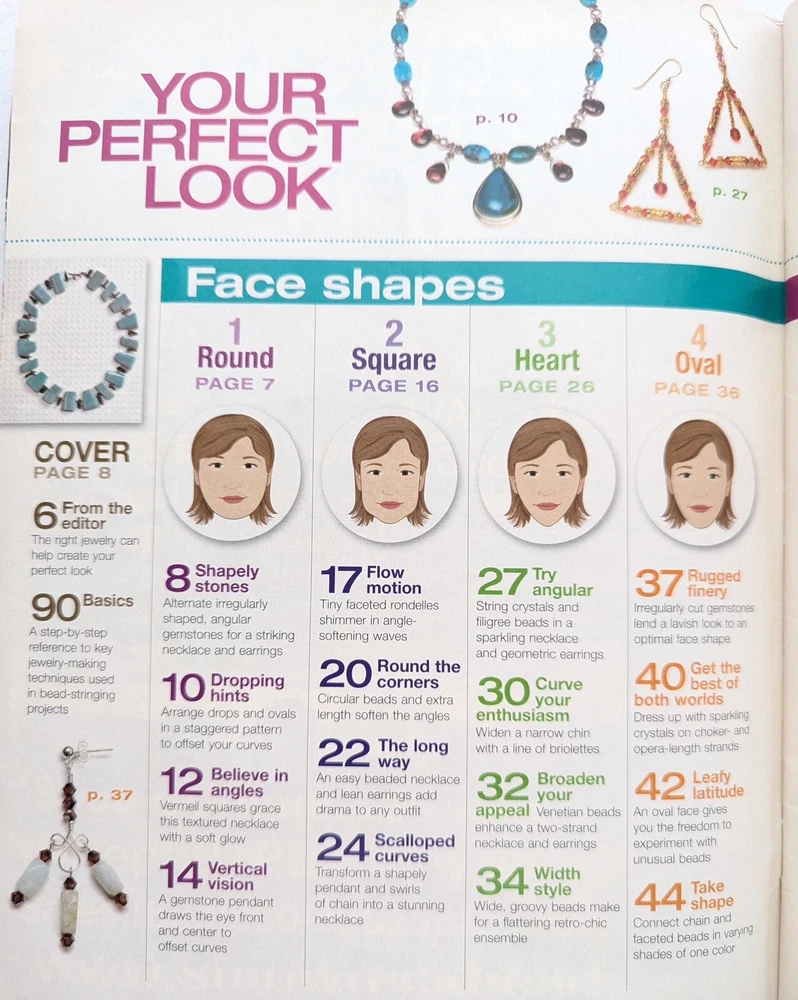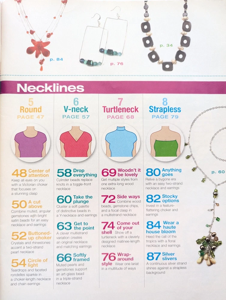 Bead Style Magazine 2006 Your Perfect Look Beaded Jewelry Making Crafting DIY - facial and neckline style recommendations- multi strand freshwater pearl cameo choker necklace - boho asymmetrical wood beaded necklace - red enamel flower floral pendant necklace.