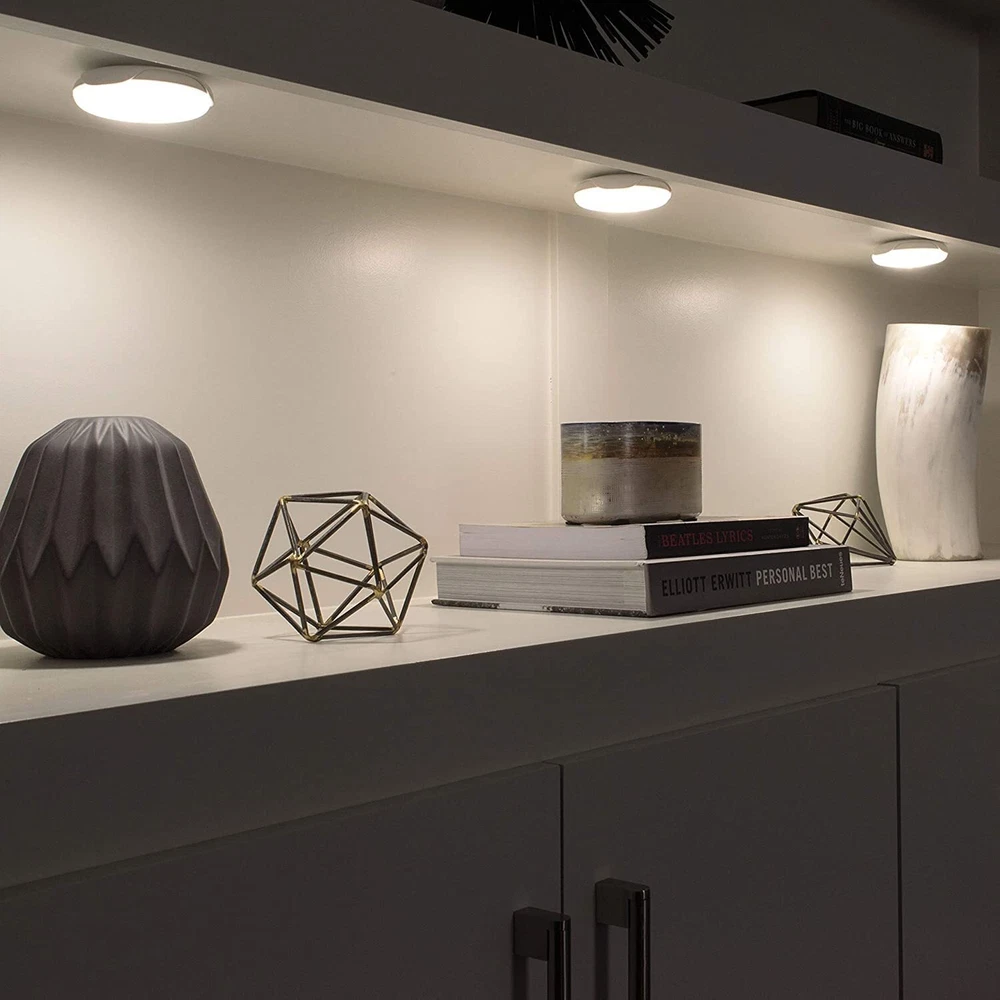 Mr. Beams Wireless LED Puck Light provides convenient hands-free light around the home. The battery-operated puck light’s intentional design includes Mr. Beams signature features, including motion activation, auto shut off, easy installation and long battery life. Its unique diffuser creates a balanced light pattern, making it the perfect under cabinet light for kitchen counters, cupboards, closets, shelves and any other workspace in the home. Battery-operated LED puck light provides 30 lumens of bright white light, perfect for under cabinets, cupboards and shelves. Motion and light sensors ensure the light is only activated when motion is detected in the dark. Auto shut off after 20 seconds of no motion helps prolong battery life. Easy, wireless installation takes less than 5 minutes with the included mounting hardware or double-sided adhesive. The puck light’s intuitive bracket design allows for easy mounting and battery . Designed to get approximately year of light on each set of batteries (not included) with average use of 8 activations a night. The LED puck light’s unique diffuser provides a pleasing and balance light pattern, perfect to light kitchen counters, cupboards, closets and shelves.