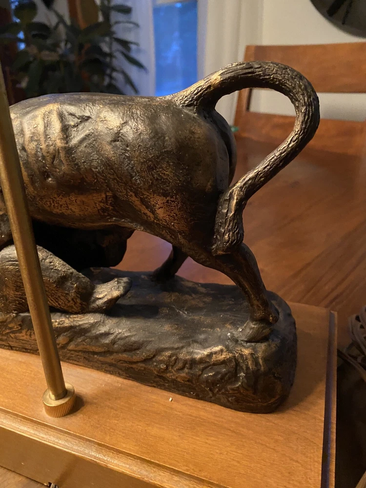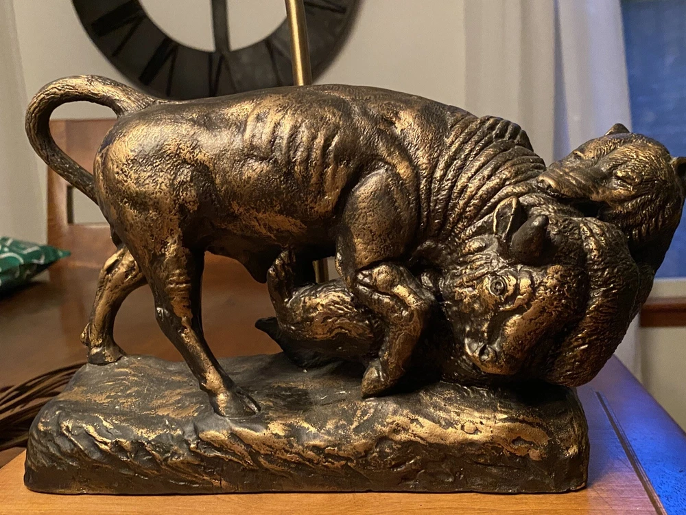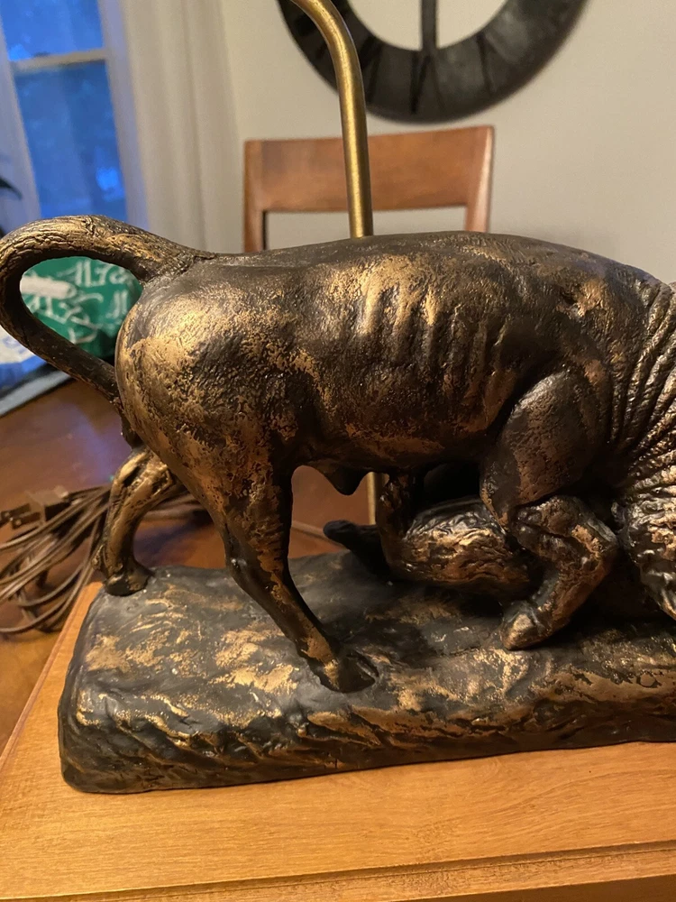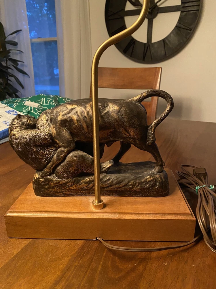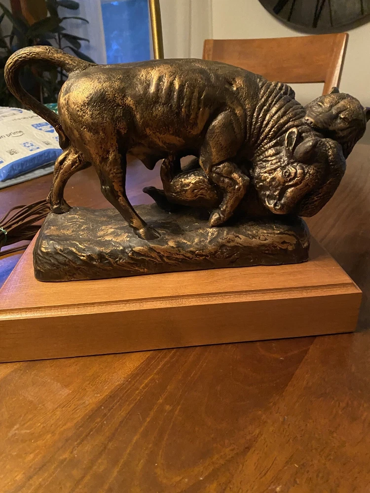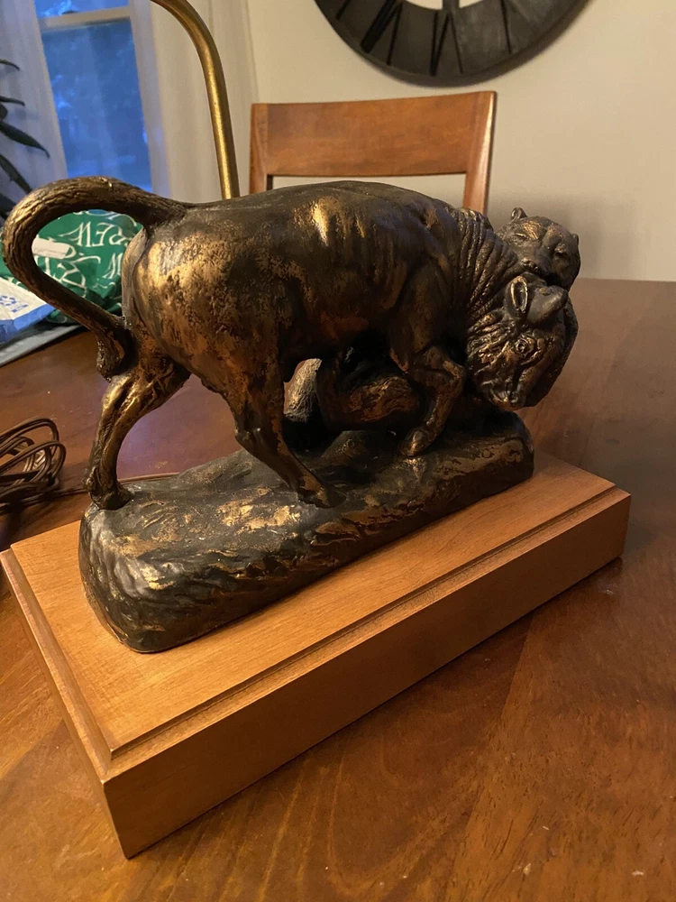 Unique Bear attacking a Buffalo figural Lamp. Ceramic type. A very cool display piece. Measures 12 x 7 x 22 1/2h. Notable: the figurine has come unglued from the wood base, and there are a few small chips around the piece where some white shows. View pictures for details. Being loose, one can use the figurine by itself should you not want to reglue it to the wood base. A very neat piece. Free shipping- all packaging and shipping included!