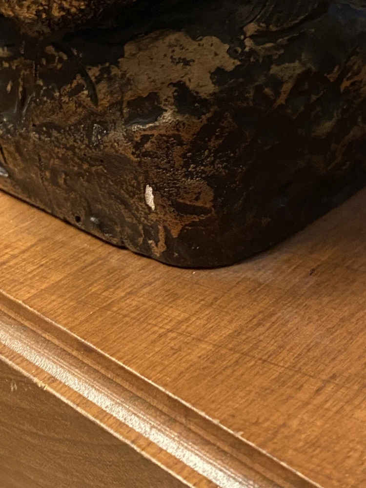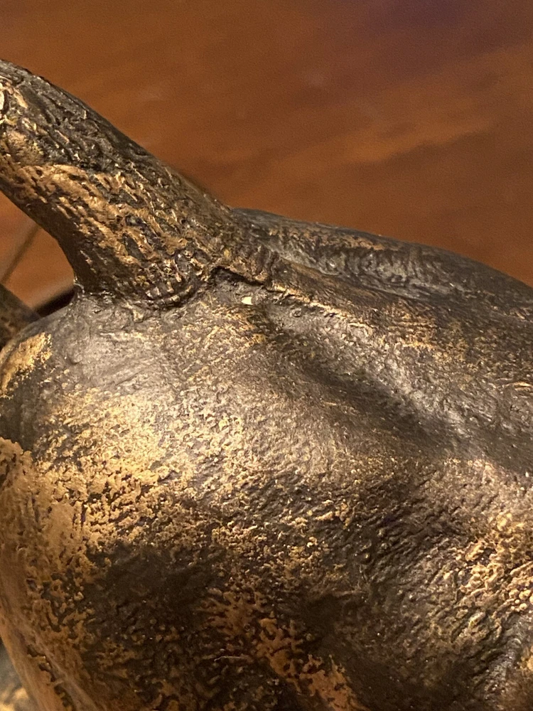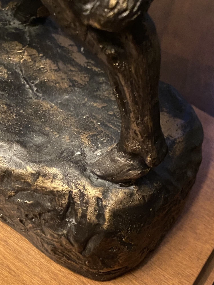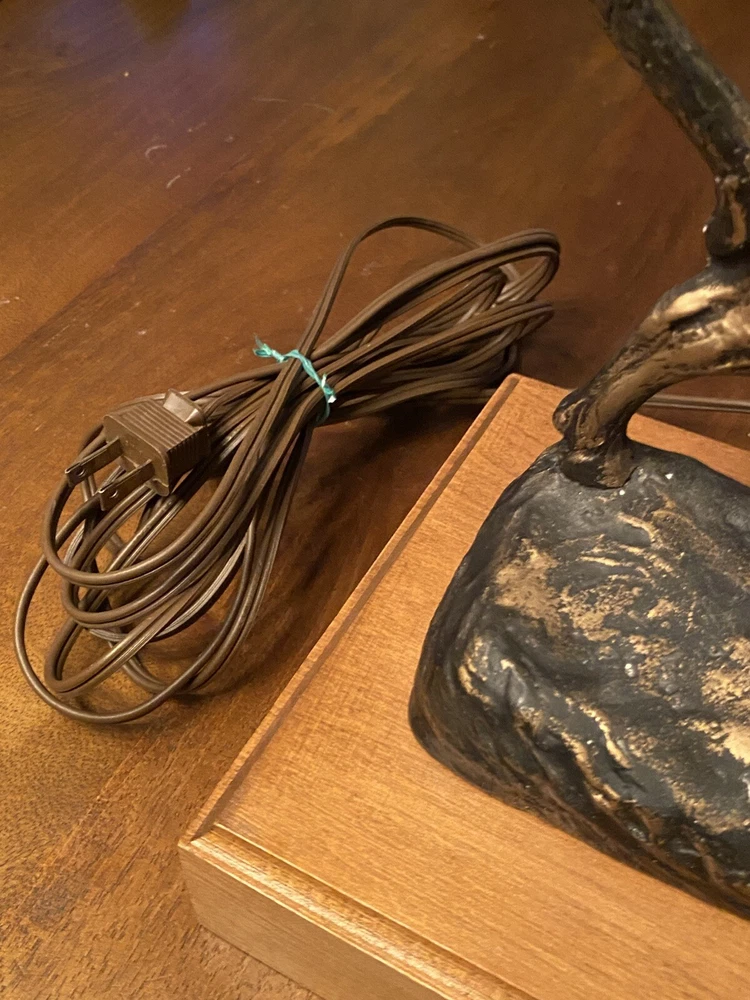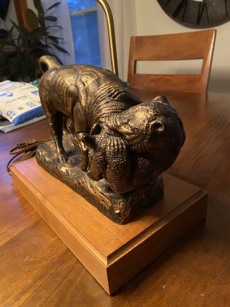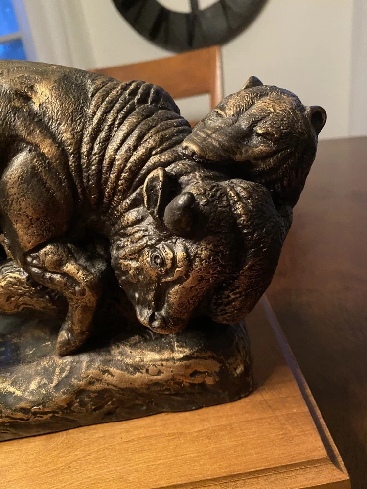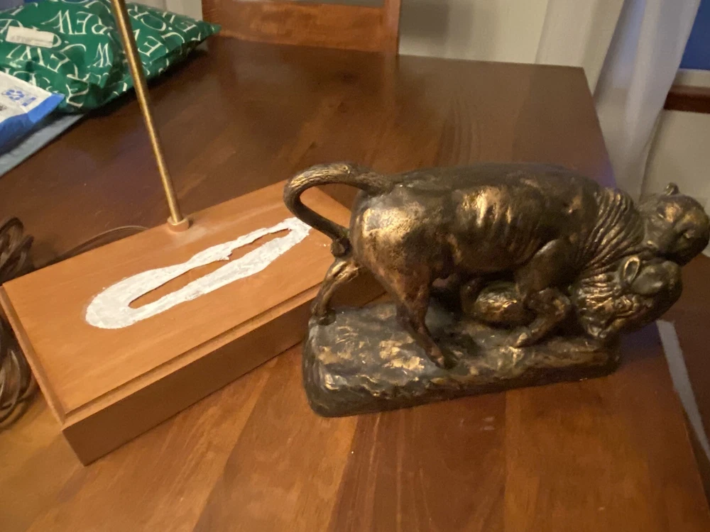 Unique Bear attacking a Buffalo figural Lamp. Ceramic type. A very cool display piece. Measures 12 x 7 x 22 1/2h. Notable: the figurine has come unglued from the wood base, and there are a few small chips around the piece where some white shows. View pictures for details. Being loose, one can use the figurine by itself should you not want to reglue it to the wood base. A very neat piece. Free shipping- all packaging and shipping included!