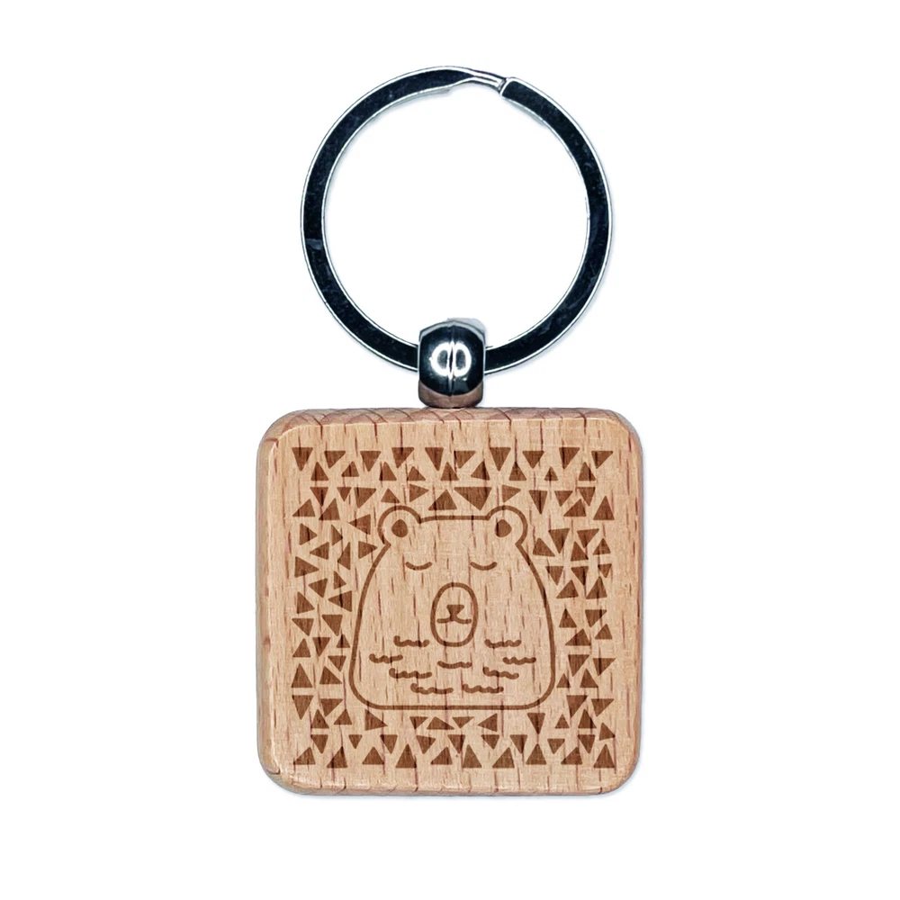 Bear Sleeping Doodle Engraved Wood Square Keychain Tag Charm