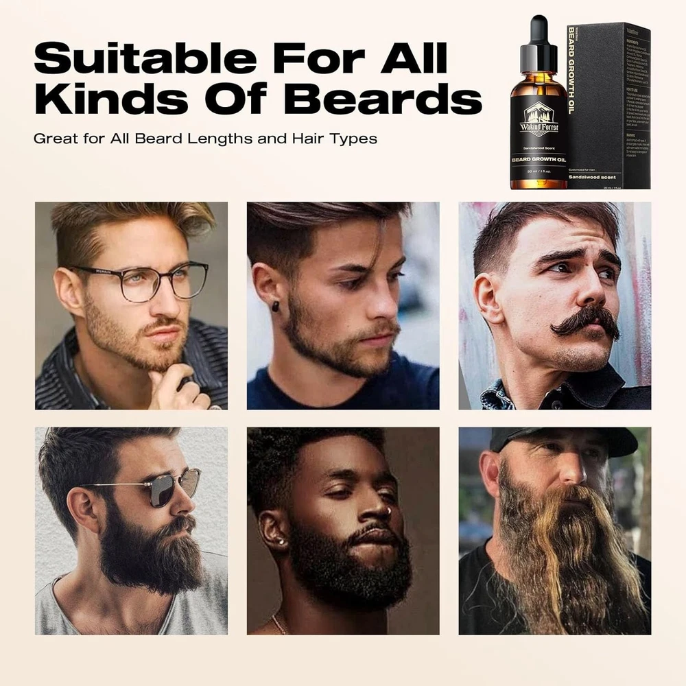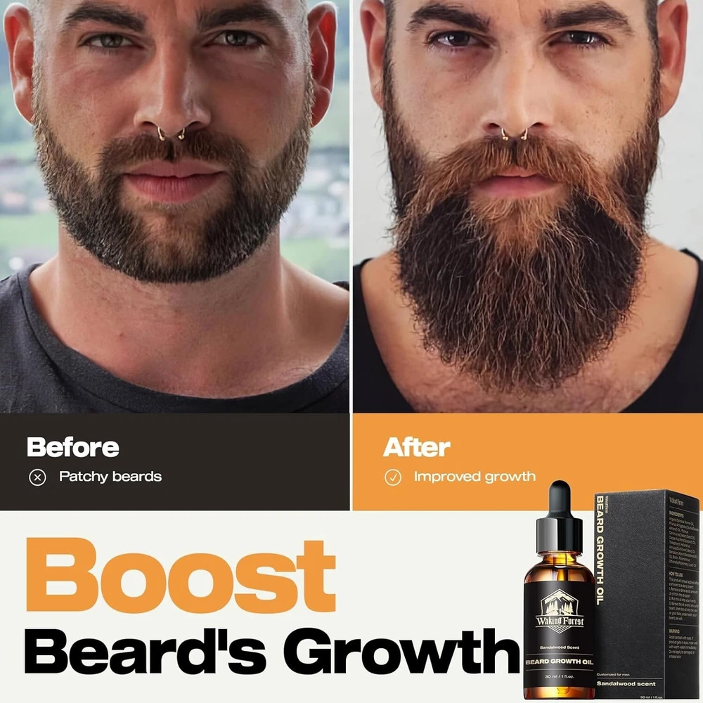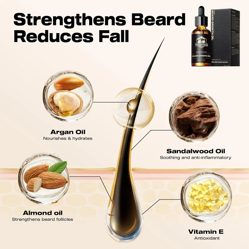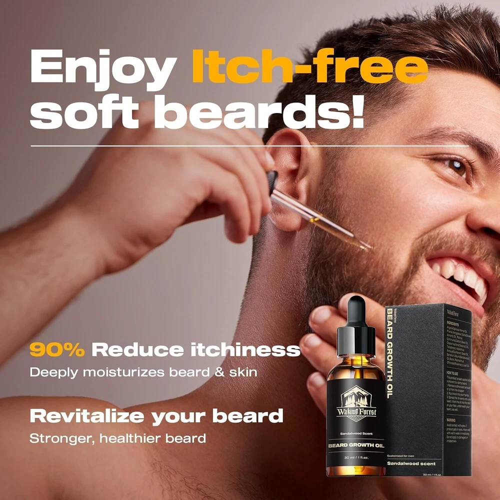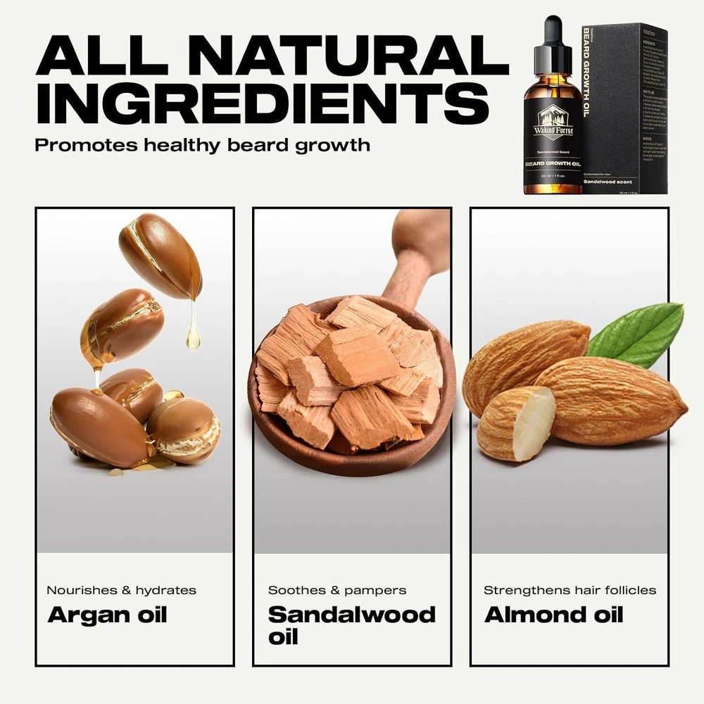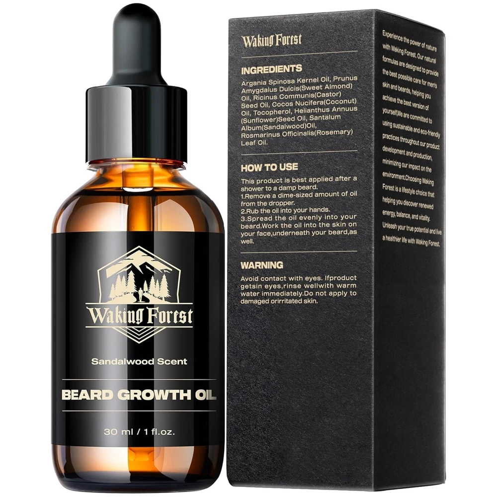 Beard Growth Oil Serum Fast Growing Beard Mustache Facial Hair Grooming 30 ml (PACK OF 1) Waking Forest Beard Oil - Beard Growth Oil Thicker Beard with Vitamin E, Rosemary, Castor Beard Oil for Men Growth, Softens & Strengthens Beard Serum(Sandalwood, 1oz) Natural Ingredients: Beard care, the way nature intended; Dive into hydration with Argania and Almond, champion growth with Castor, and shield with Vitamin E; As Sandalwood relaxes, Rosemary energizes; For the man committed to a natural beard journey Boost Beard Growth: Is your beard looking a little patchy? Not to worry! Our beard oil for men growth contains Castor Seed Oil and Rosemary Oil, known to promote hair growth by stimulating hair follicles; Vitamin E also fosters stronger hair growth Soothe the Itch: Say goodbye to constant scratching and irritation; Our beard oil with Sunflower Seed Oil and Vitamin E help to soothe and calm irritated skin beneath your beard; reducing itchiness and redness; Enjoy a non-irritating beard every day Indulge in Sandalwood Scent: Our beard oil for men growth is also infused with the captivating aroma of Sandalwood Oil; This rich, warm scent will make you feel like a true gentleman, turning heads and leaving a lasting impression wherever you go We Care About U: Waking Forest is committed to providing pure, natural products and cares about each user's experience; As a responsible company always measured by high social standards; Your satisfaction matters; Share your thoughts and join our journey Note: This Product is designed to deliver optimal results, offering high-quality performance and satisfaction. Please note that individual experiences and outcomes may vary based on personal use, preferences, and unique circumstances. For best results, we recommend following the provided guidelines and ensuring the product is used as intended. Product result may vary for every individual.