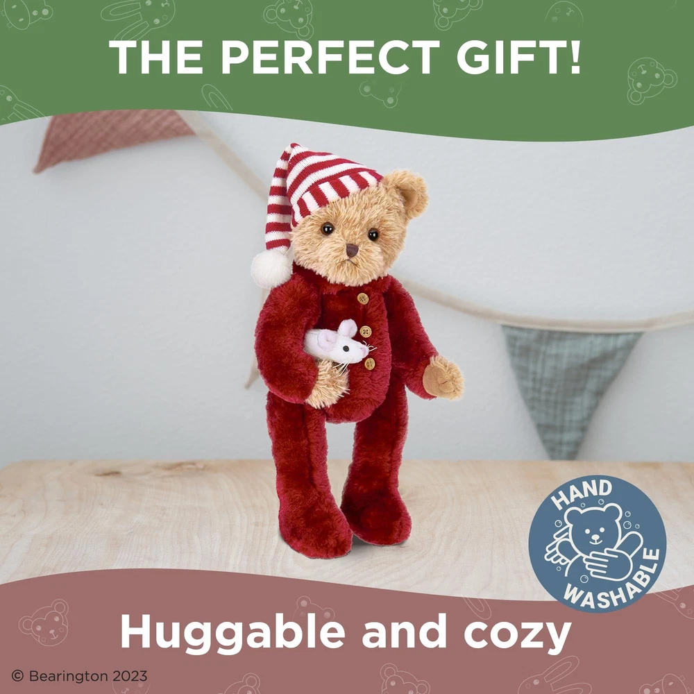 You will love the fine detail award winning Bearington Collection uses to bring Sleepy & Squeek, the Twas the Night Before Christmas themed teddy bear, to life. Hand crafted using the most luxurious, soft plush, this bear makes a special gift or a great addition to your holiday décor. Soft and pose-able, Sleepy & Squeek is perfect for anyone from a collector to a special child in your life. Measures 14" tall when standing. Founded in 1997, Bearington is the proud recipient of more distinguished design awards than any other teddy bear company. Over the years, Bearington has received more than 100 industry design awards and nominations which include: 1 Canadian Collectible of the Year Award, 2 NALED Plush of the Year Nominations, 2 CIB Collector’s Choice Awards, and several TOBY Industry Choice Awards, TOBY Public Choice Awards, and Golden Teddy Awards and Nominations. CHRISTMAS CLASSIC: Illuminate the festive spirit with our Christmas Classic, a 14” tall adorably cute teddy bear. Inspired by 'Twas the Night Before Christmas, this holiday bear is garbed with a red and white knitted nightcap, keeping the holiday vibe alive. A delightful gift to treasure, our Christmas teddy bear comes with a lovable mouse buddy. Its surface is washable, making it easy to clean. Touch, hug and savor the season's joy with our Christmas bear! COLLECTIBLE QUALITY: Handcrafted with high-quality premium materials, this bear exudes an unrivalled softness ideal for snuggly winter nights. As a treasured element of annual holiday traditions, this Christmas Bear captivates not just as a toy, but as a magnificent collectible. Our Holiday Bears collection signifies excellent workmanship made to make your Christmas magical and memorable. POSABLE: This unique holiday bear is not your typical Christmas stuffed animal. It features jointed arms, legs, and a head, enhanced by a bean bag weight, rendering it fully posable - a charming trait that sets it apart! Crafted to spread Christmas cheer, this endearing Christmas bear holds the magical wonder of the holiday season. Snuggle-ready and heartwarming, this posable bear makes for a perfect Christmas gift, infusing homey holiday spirit into your festive celebrations. SPECIAL GIFT: Discover the magic of Christmas with our enchanting Christmas Teddy Bear. This holiday bear is more than just a plush toy - it's a huggable, lovable addition to your Christmas décor and a perfect stocking stuffer. Ideal for bear collectors, children, or anyone who appreciates the joy of the season. Our Christmas Stuffed Animals make memories, start traditions and spread holiday cheer. Give the gift of cuddles and warmth this season with our adorable Holiday Bears. AWARD-WINNING TOYS: Experience the magic of Christmas with Bearington's award-winning, children's favorite plush toys. Celebrating over 25 years, we're excited to introduce our 2023 enchanting Christmas line. Featuring adorable Christmas stuffed animals for kids, such as the rosy-cheeked snowman toy and the always-loved Christmas bears. Our Bearington Christmas plush collection brings festive charm, creating soft, enduring memories with our cuddly snowman plush and bear toys.